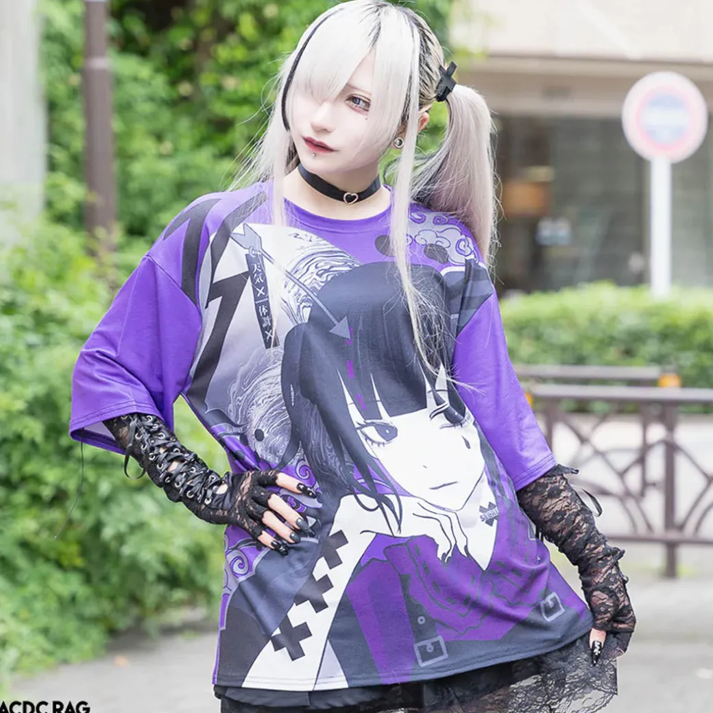 Experiment with your style by wearing this purple shirt! It has illustrations of a Harajuku girl who’s a bit sad due to bad weather! This winning shirt design entry was created by @hlvngkam for the 2023 ACDC RAG Design Contest.