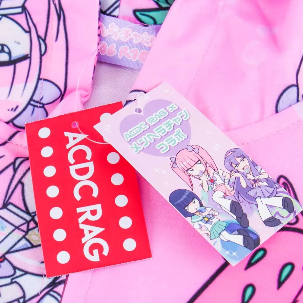 - A kawaii Harajuku-style windbreaker jacket illustrated with Menhera-chan from the Yamikawaii fashion trend sitting on strawberries while drinking milk