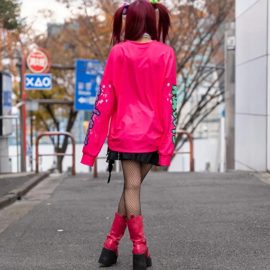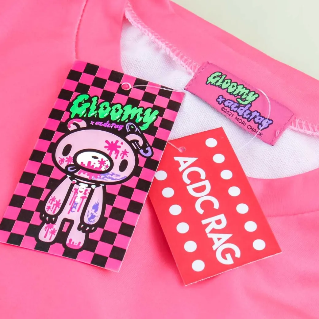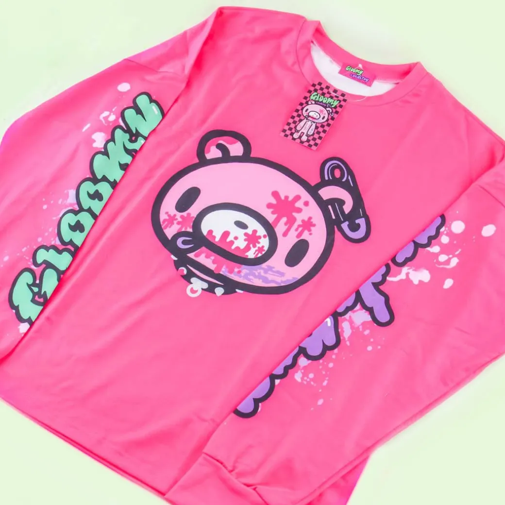 - A kawaii long-sleeve bright pink shirt featuring prints of Gloomy Bear
