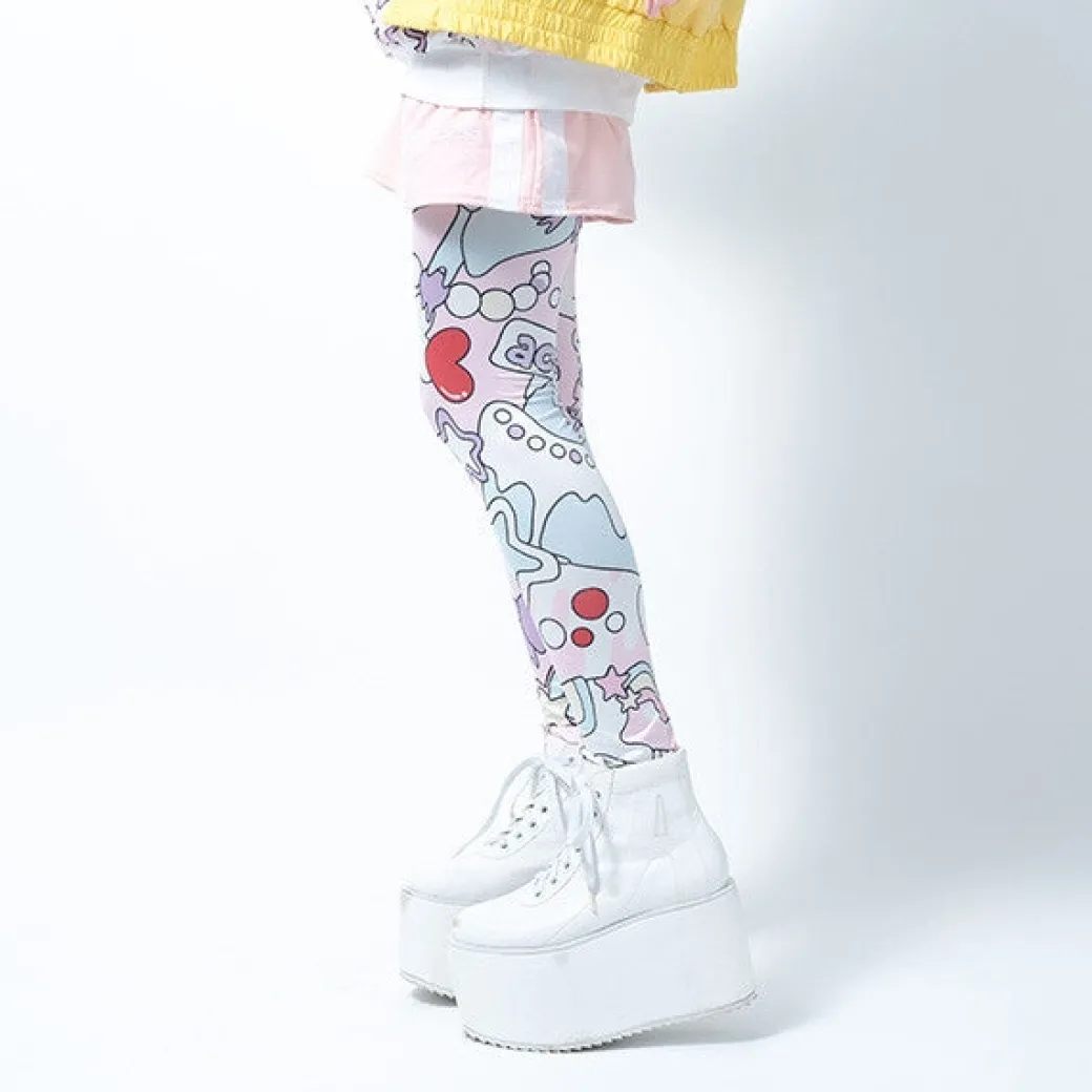 - A pair of kawaii leggings with illustrations of sweets, unicorns, stars, and hearts