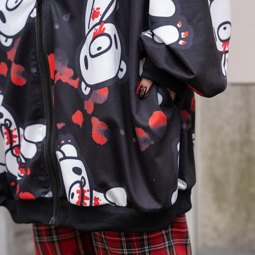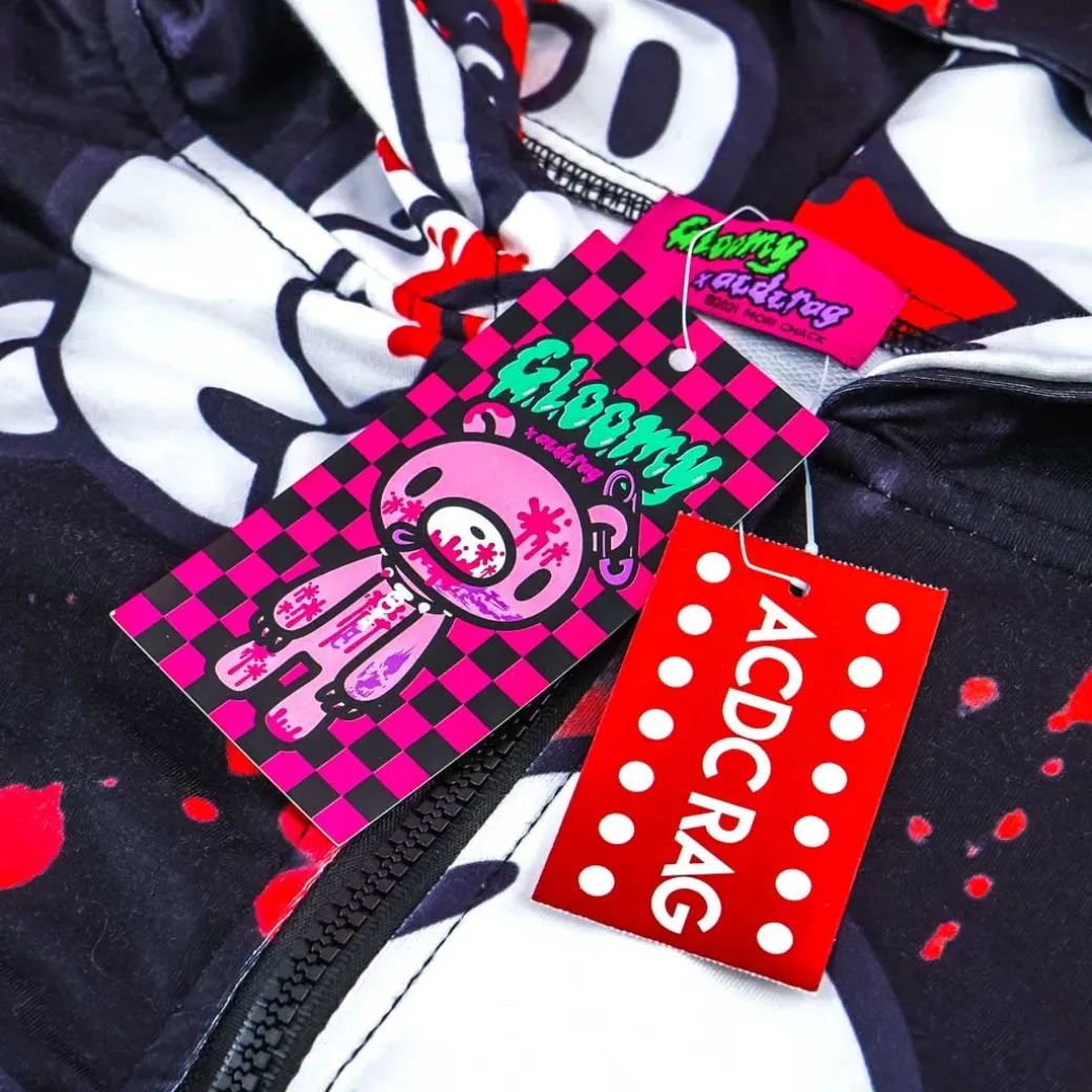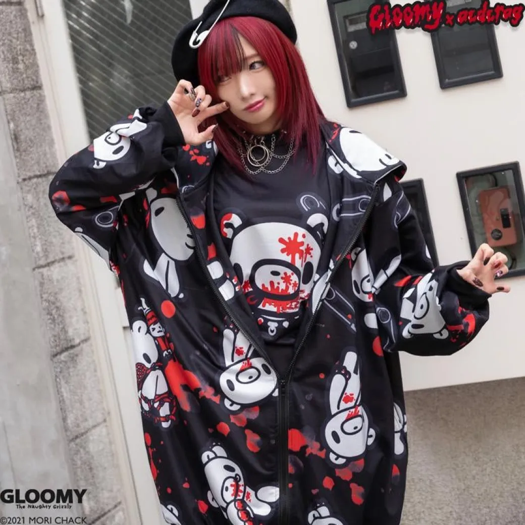 - A kawaii Harujuku-style dark zippered hoodie featuring prints of Gloomy Bears and pins