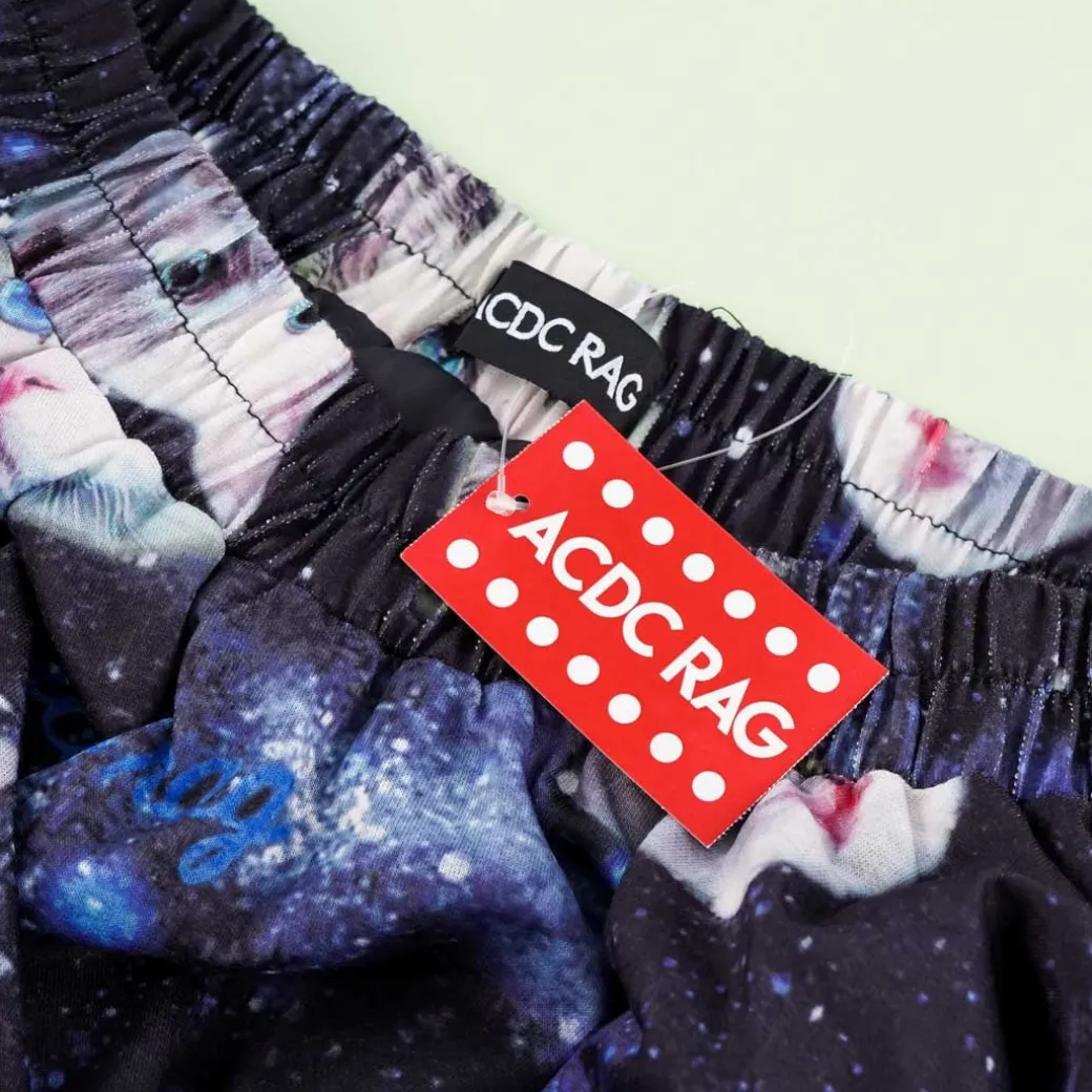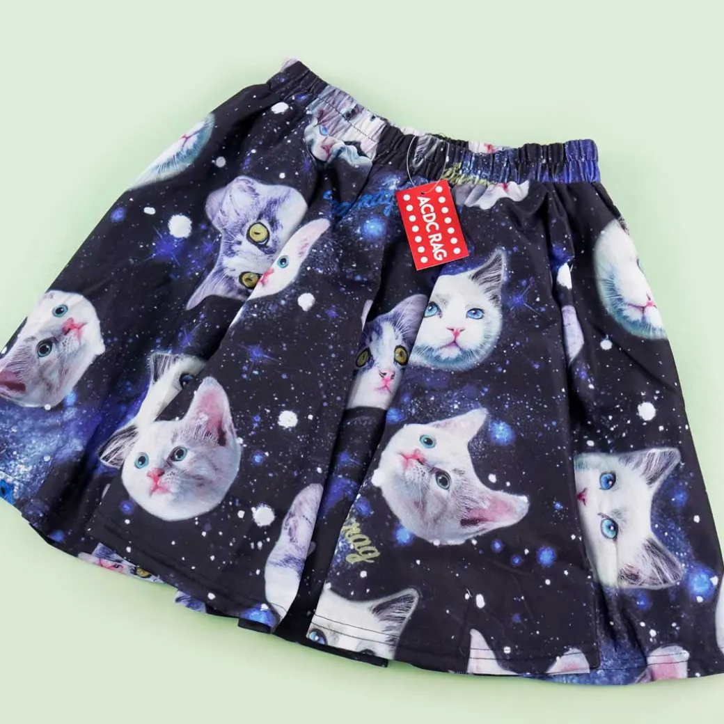 - A kawaii Harajuku-style flare skirt illustrated with cats floating in space