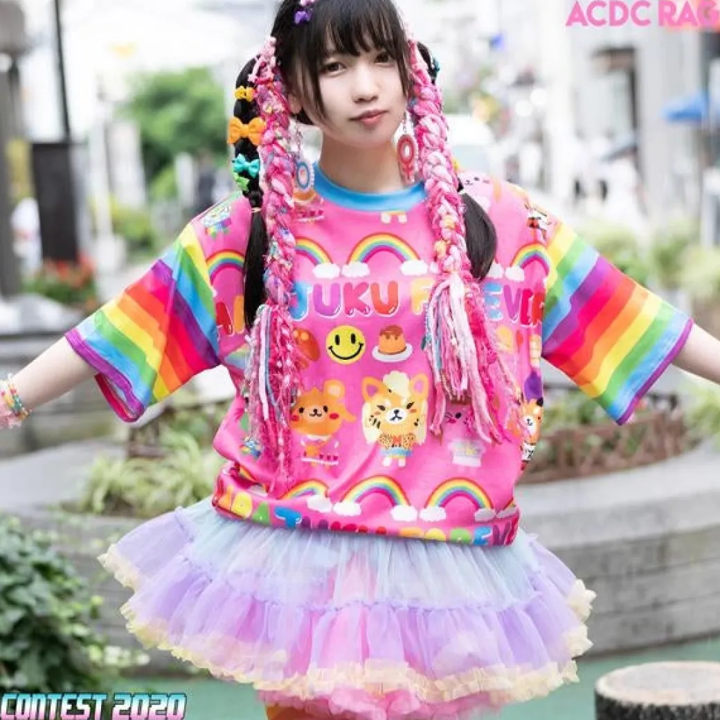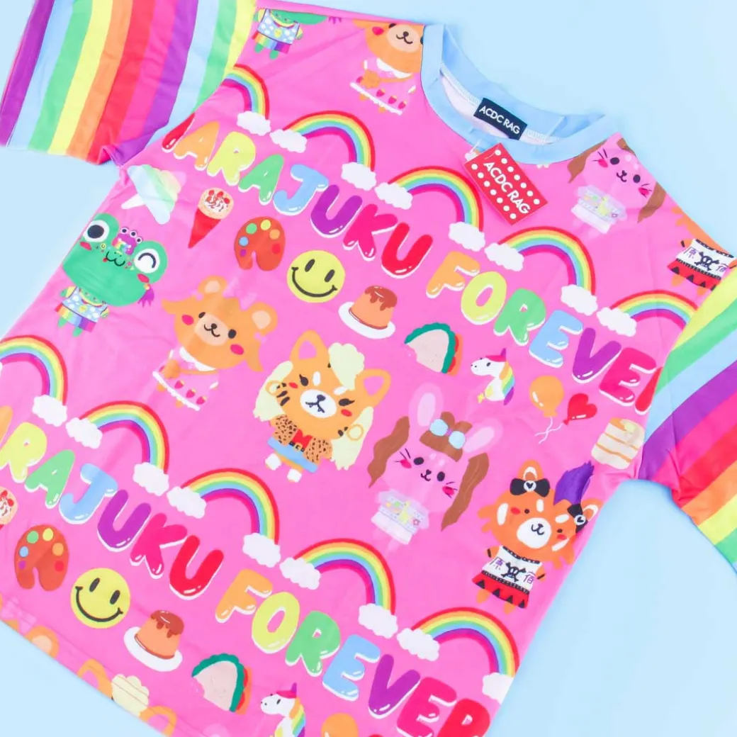 - A kawaii t-shirt with cute animals, rainbows, and Harajuku treats