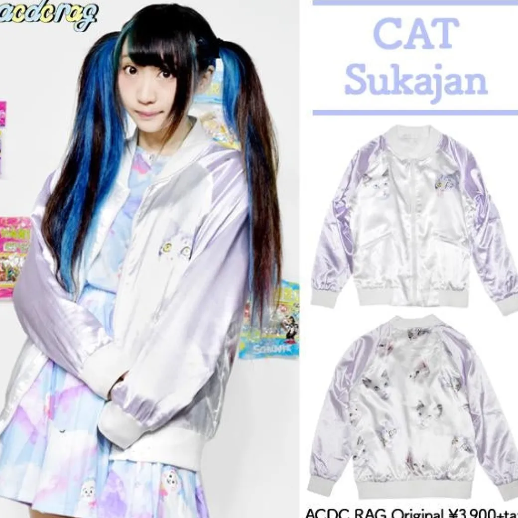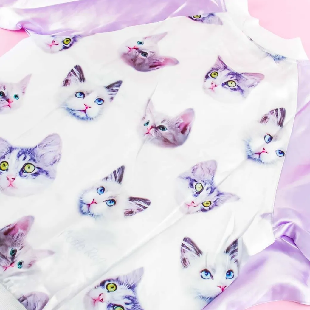 - A super kawaii Harajuku-style pastel bomber jacket featuring prints of cats