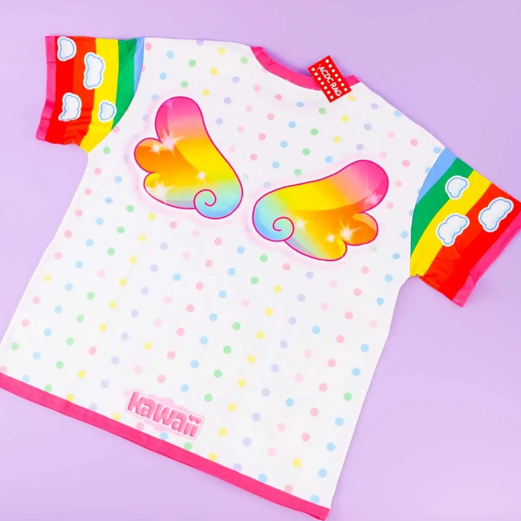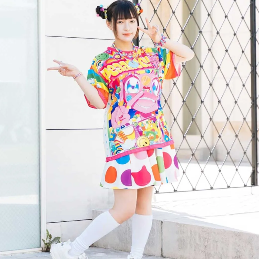 - A kawaii t-shirt with rainbow-colored illustrations of smileys and a smiling girl