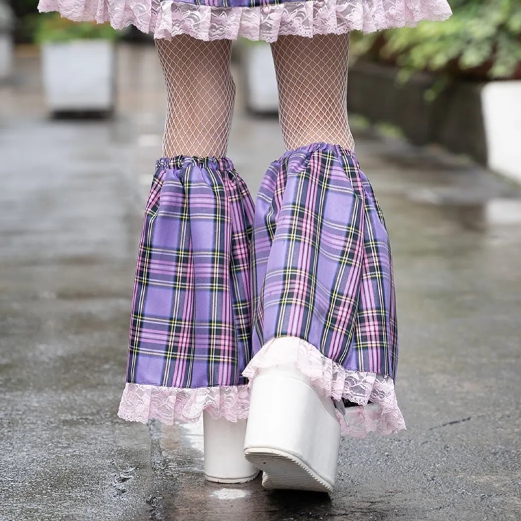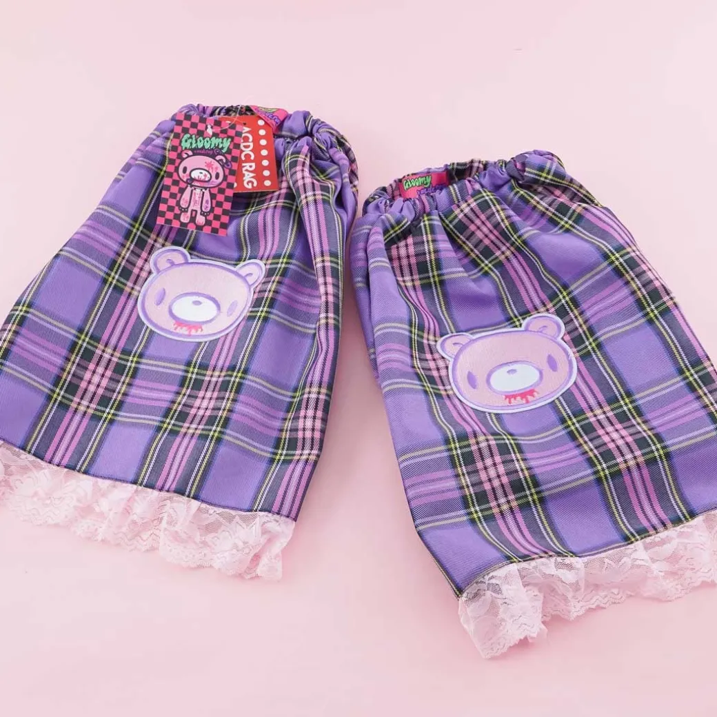 - A super cute pair of plum-colored leg warmers featuring prints of Gloomy Bear