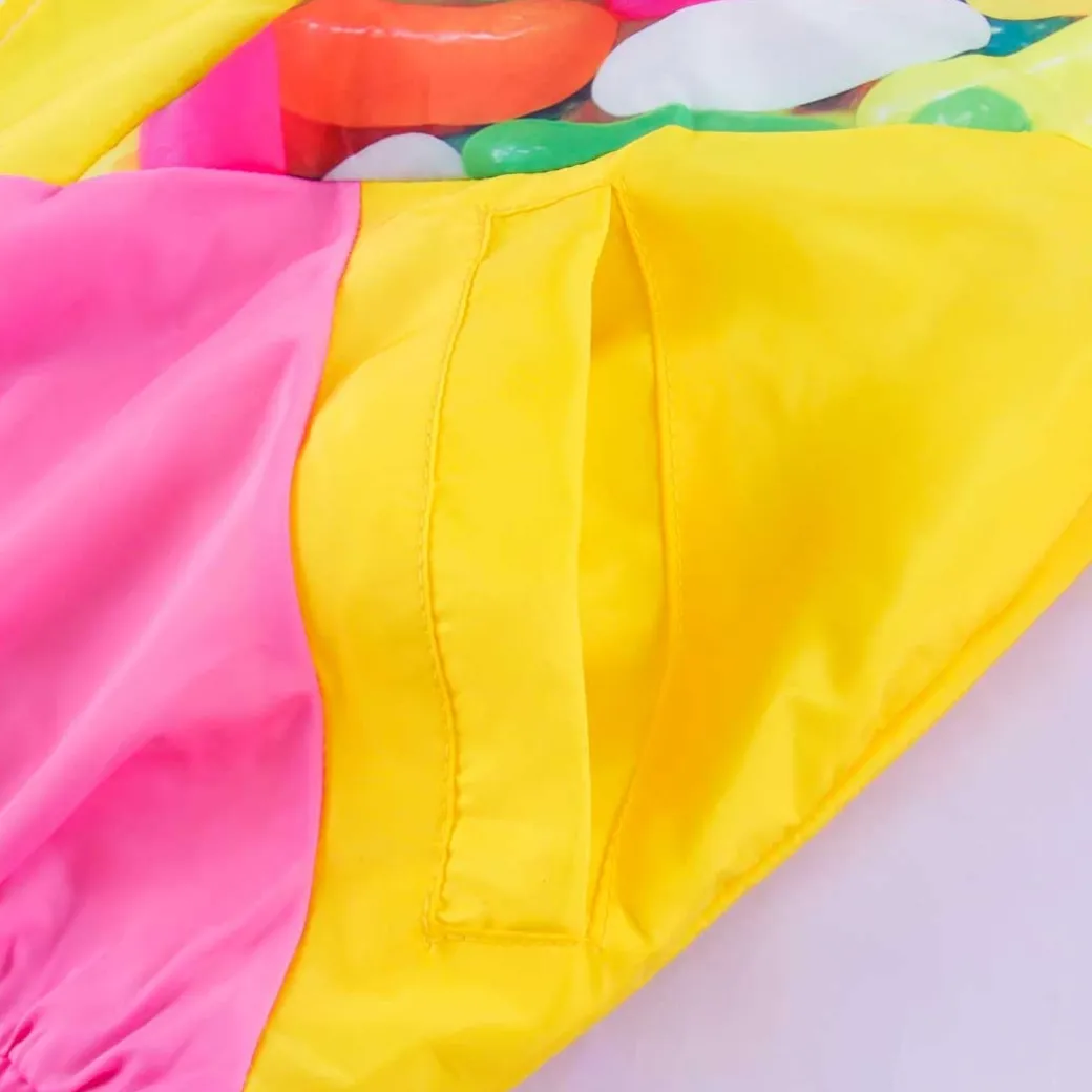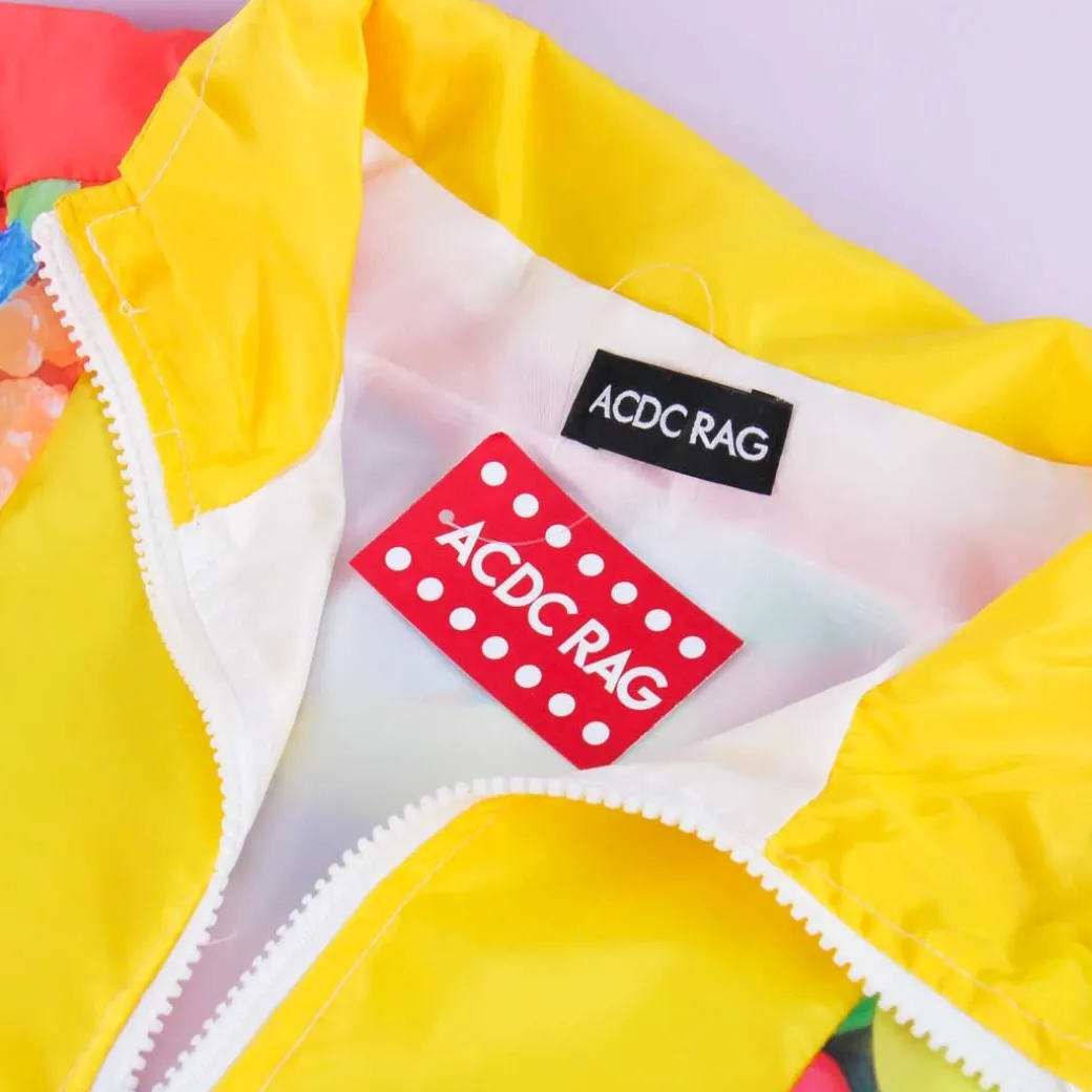 - A kawaii zippered neon jacket with illustrations of jelly beans