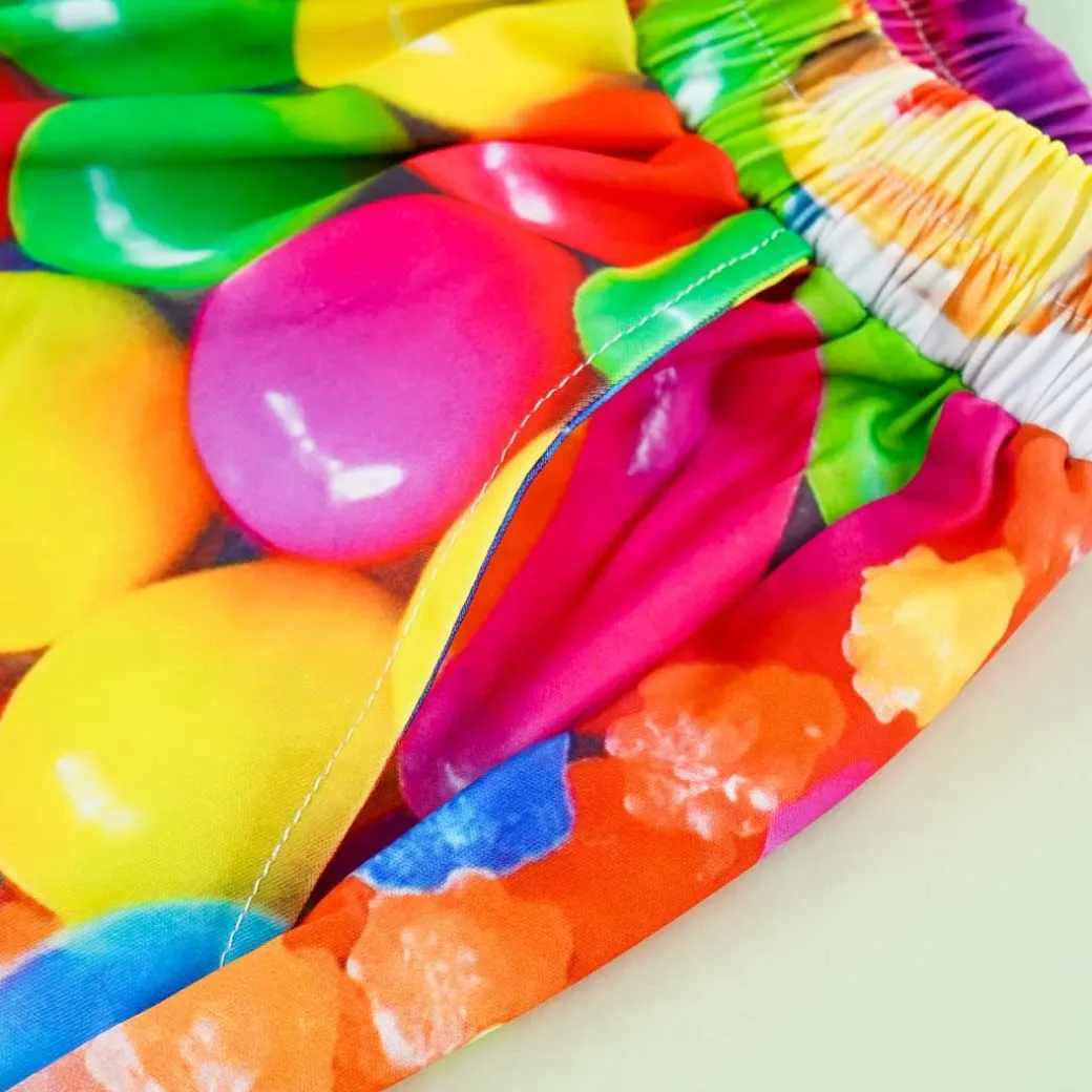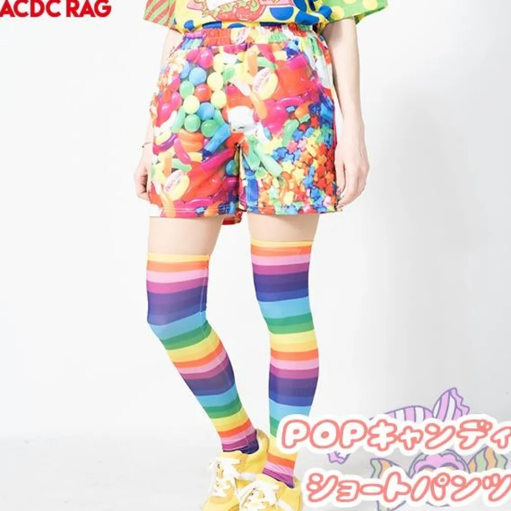 - A pair of Harajuku-style pop art shorts covered in prints of bright candy