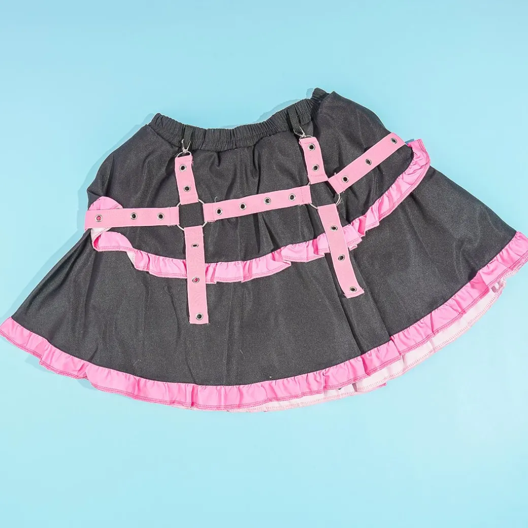 Show your love for punk or yami-kawaii fashion by wearing this skirt! It features a combination of harness and frills, plus a cross-shaped metal charm. This skirt comes from the popular ACDC RAG Bunny Dolls collection!