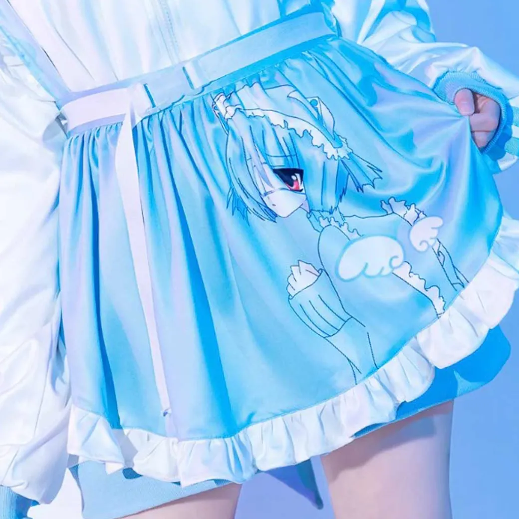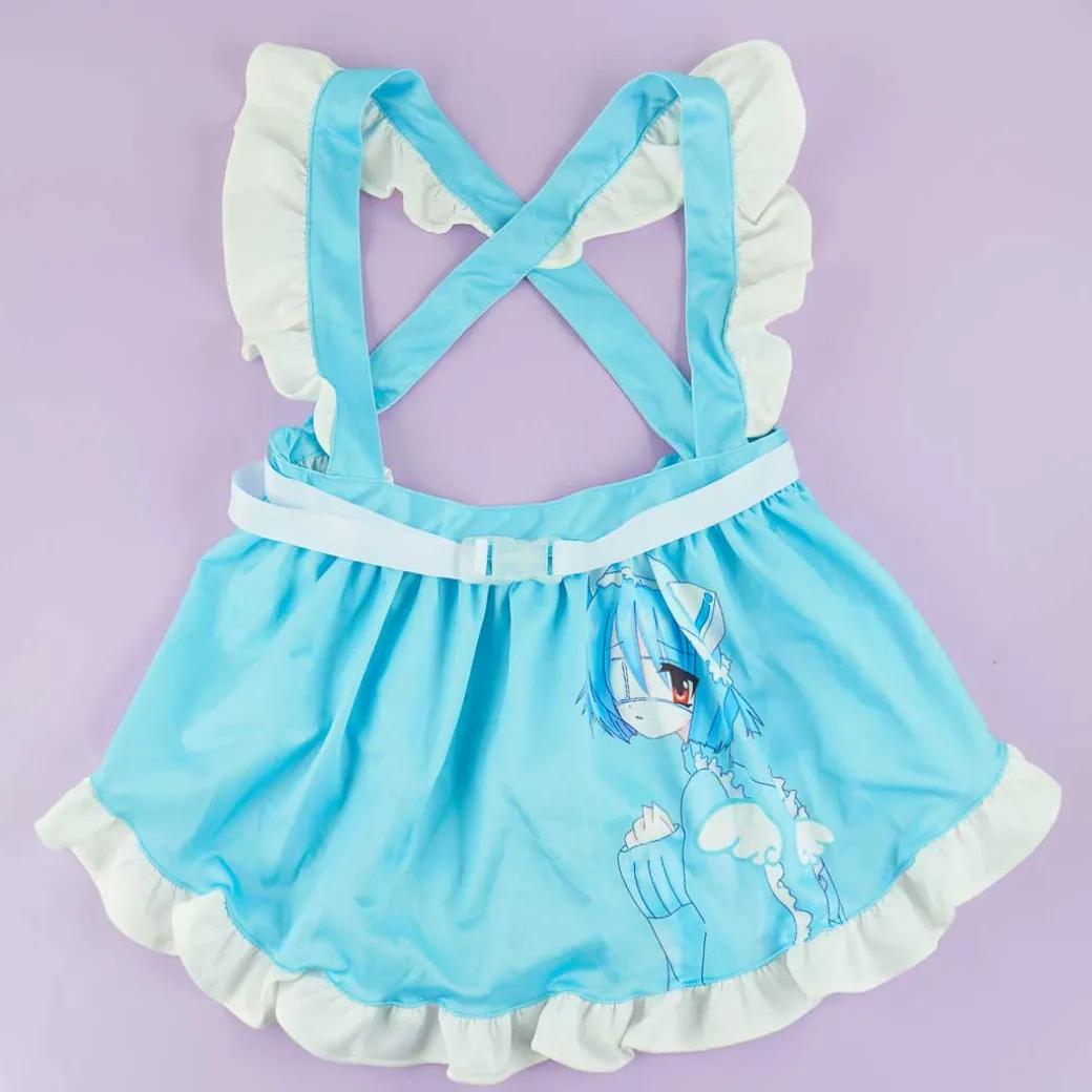 Complete your kawaii outfit by wearing this frilly pastel blue apron! It’s decorated with a print of Rei-chan, the Cyberpunk girl character created by Japanese artist Nakami Takeo for the Harajuku-based clothing brand, ACDC RAG!