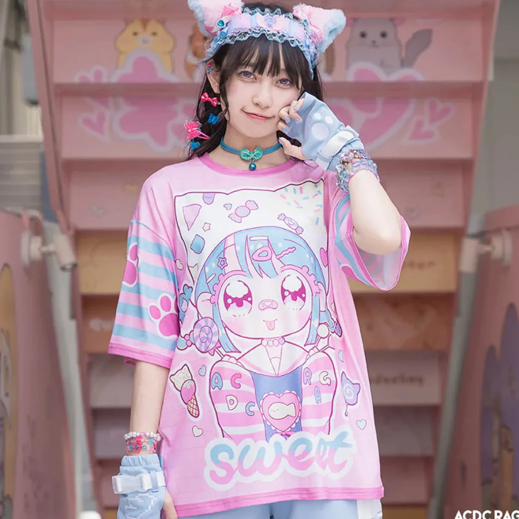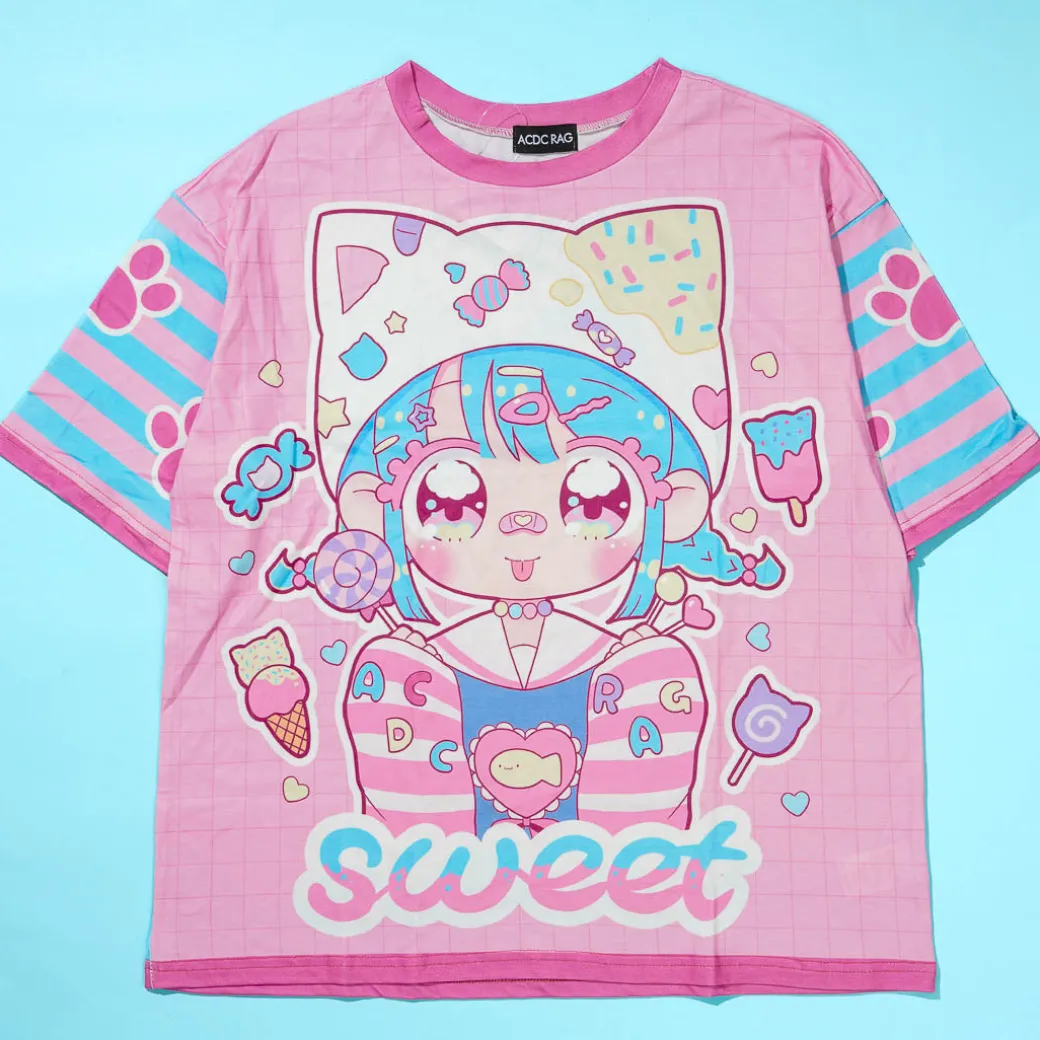 This winning design from the 2023 ACDC RAG Design Contest was created by @tasuki6918 and features pastel prints of a cat-like kawaii girl! Add a dose of cuteness and Harajuku flair to your everyday look by wearing this shirt.