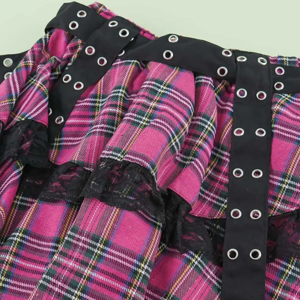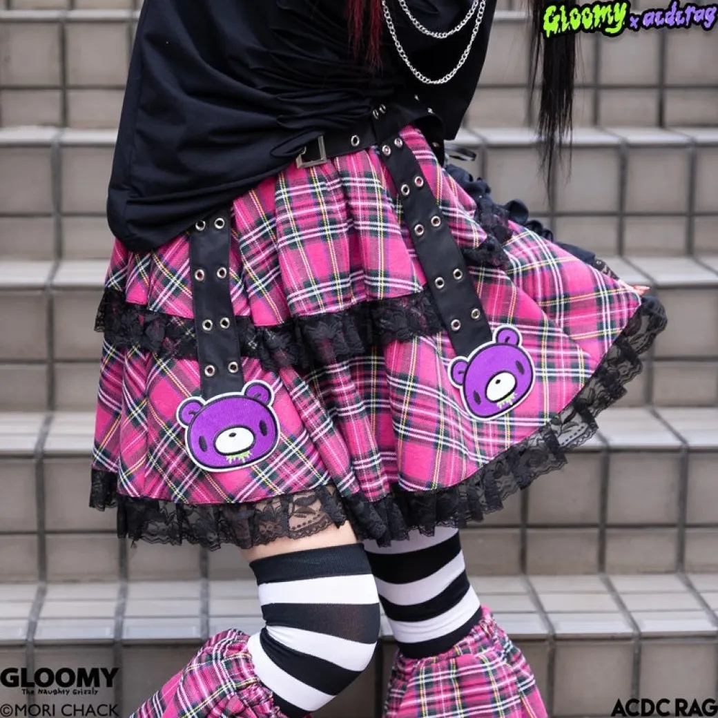 - A cute checkered skirt featuring a vivid pink print of Gloomy Bear