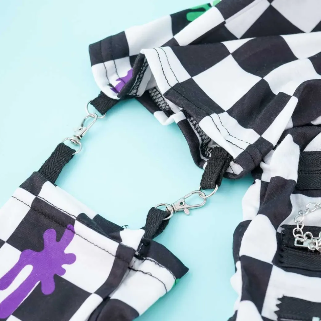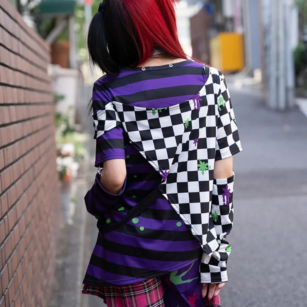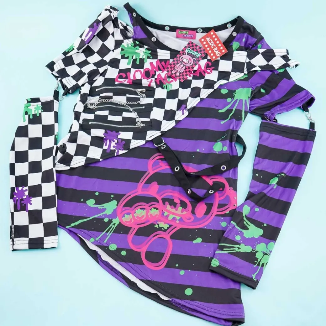 - A kawaii long-sleeved top with striped and plaid patterns, and with a neon print of a bloody Guru-mi from Gloomy Bear