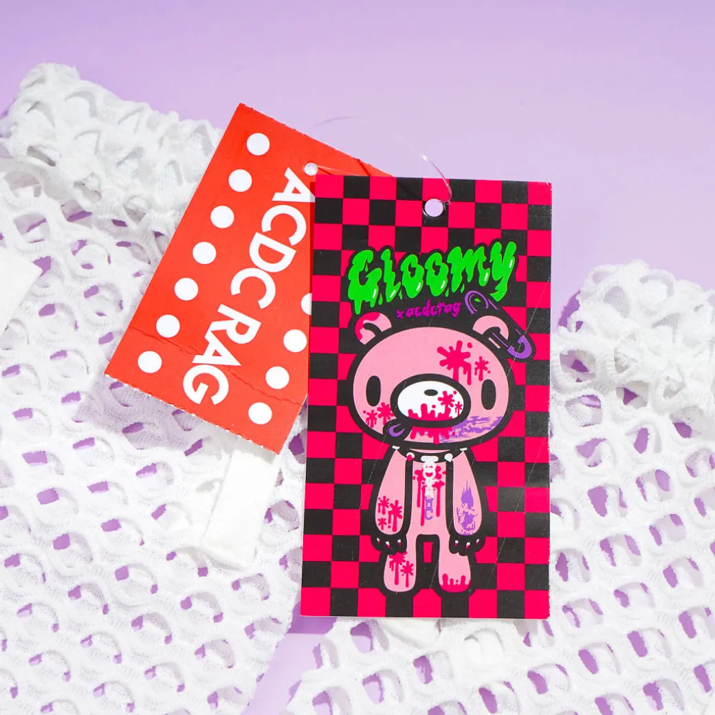 This cute pair of mesh arm warmers comes from a collaboration between ACDC RAG and Gloomy Bear! Put on these kawaii arm warmers to accessorize your kawaii outfit of the day. Each arm warmer has a fun mesh design with add-on straps, rings, and embroidery of Gloomy bear.