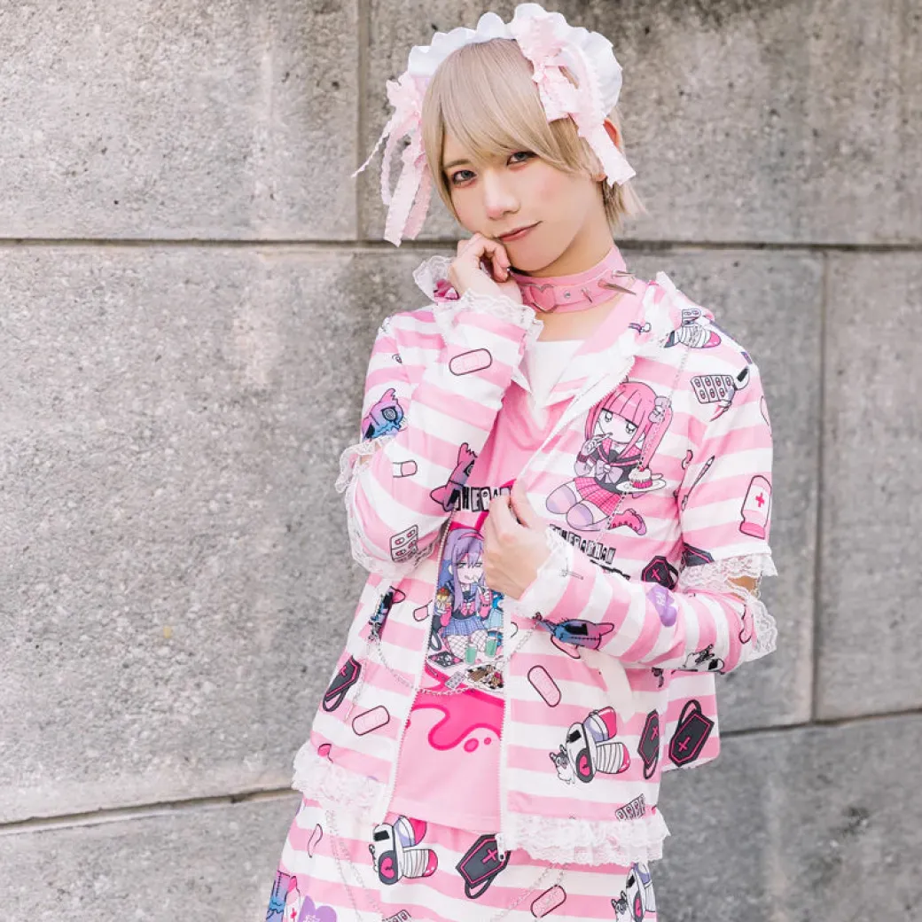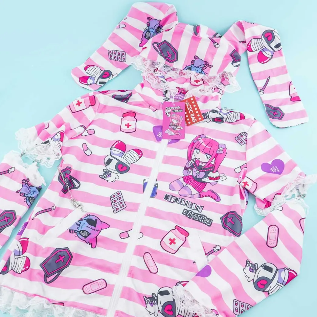 - A kawaii pink and white striped Menhera-chan zippered hoodie