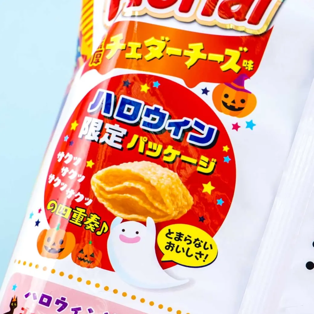 - A Halloween-themed bag of corn snacks coated in thick cheddar cheese powder