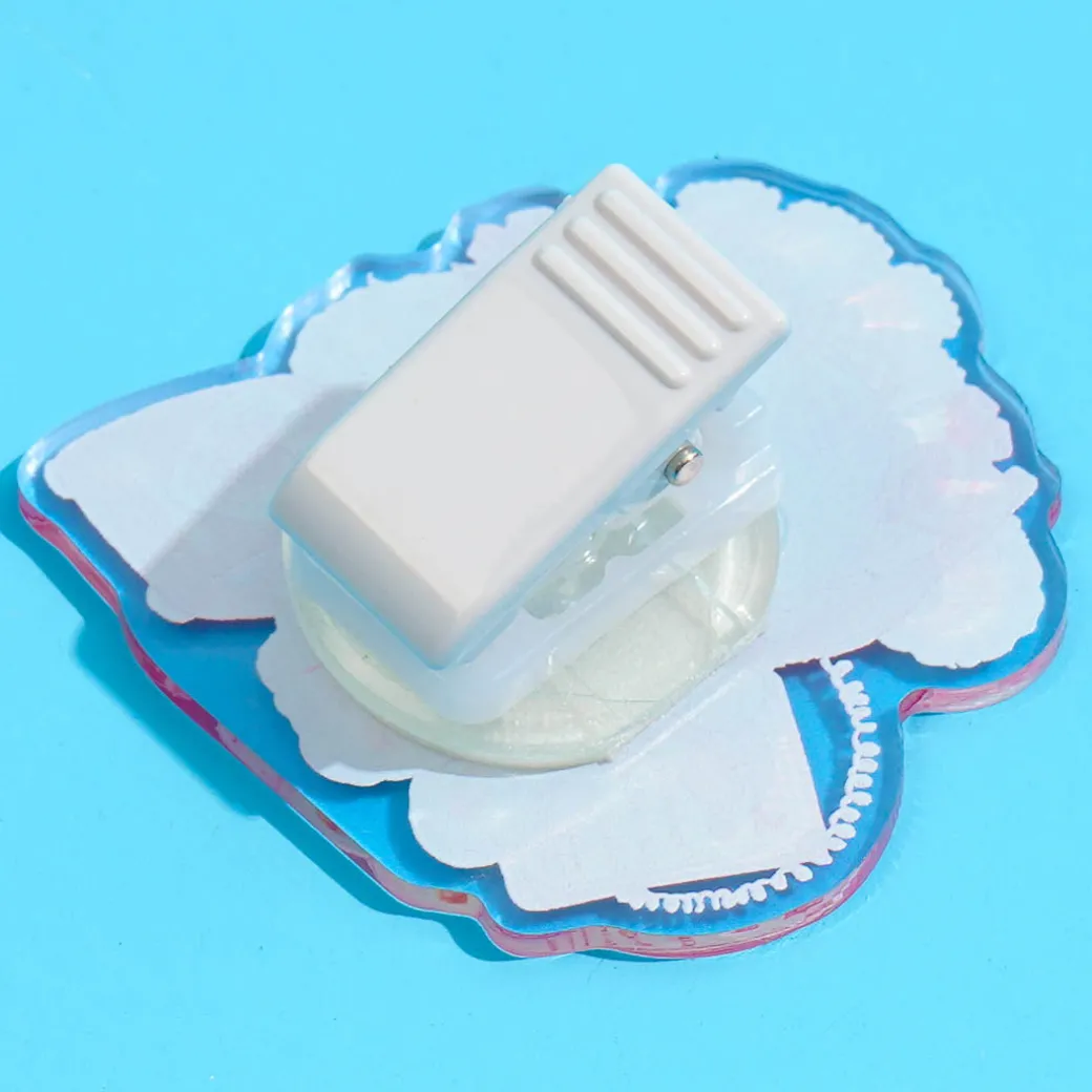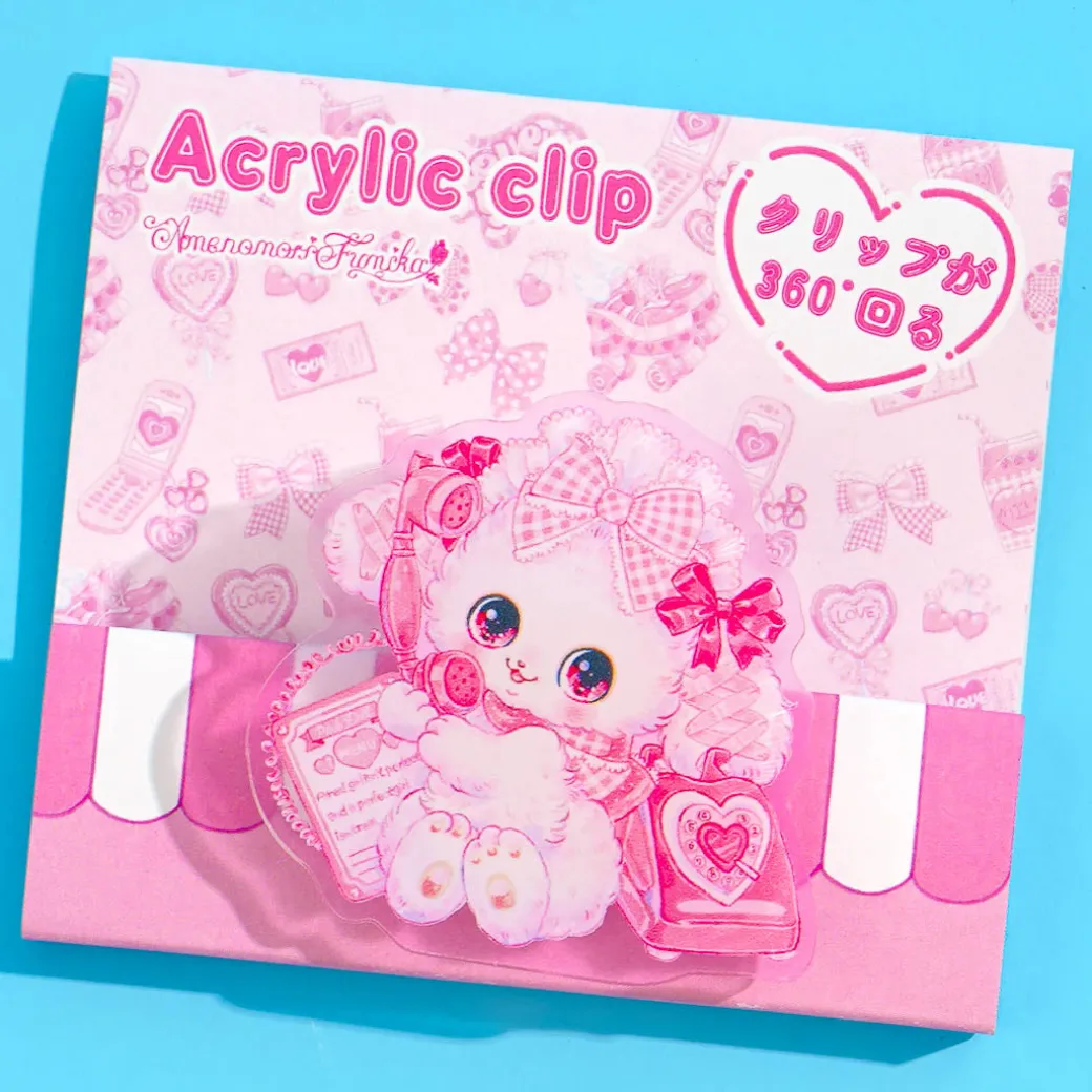 This super cute acrylic clip showcases a die-cut illustration of a fluffy bunny from Amenomori Fumika’s “Idol Pink” design. Use it to clip your memos or save a page when reading a book! The clip can even be rotated 360 degrees.