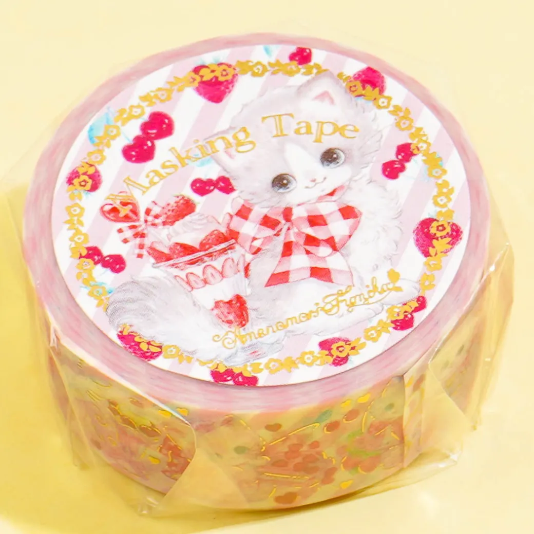 Add this super cute roll of washi paper masking tape to your crafting kit. It features prints of a cute cat posing with a strawberry parfait! Use it to decorat your favorite journal or planner.