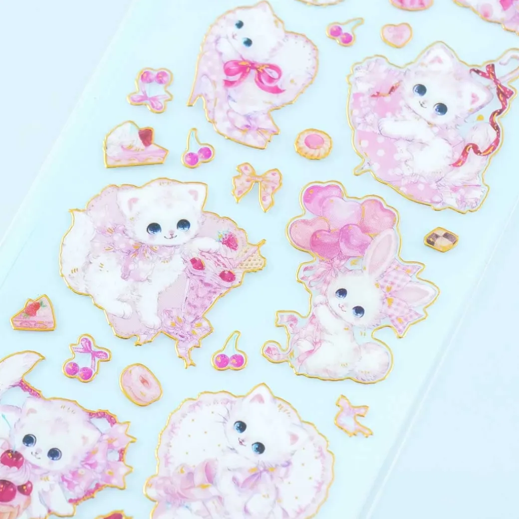 - A super cute sheet of die-cut stickers featuring sweet kitties and bunnies