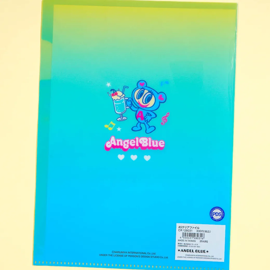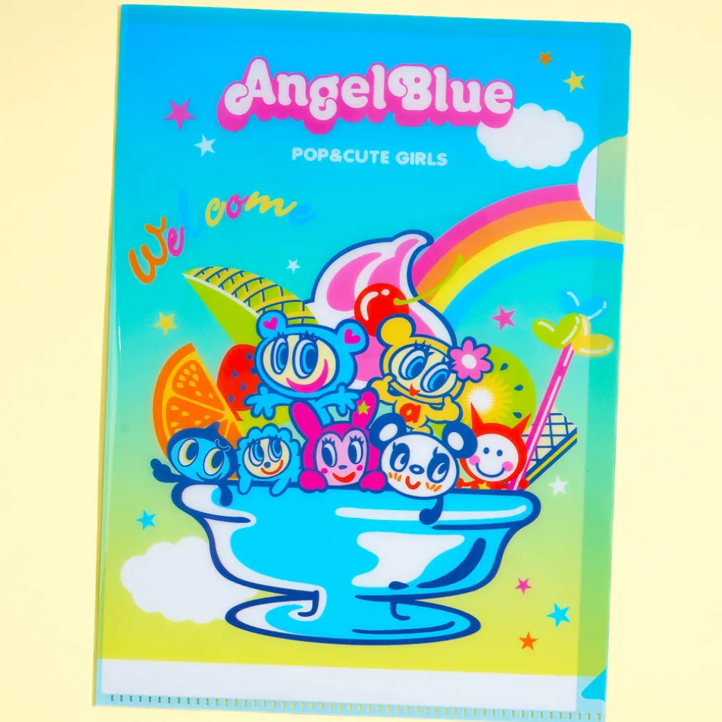 This kawaii clear file folder features prints of Angel Blue characters stuffed together in a sundae cup. Angel Blue is a popular 2000s Japanese fashion brand. Use this folder to sort your documents.