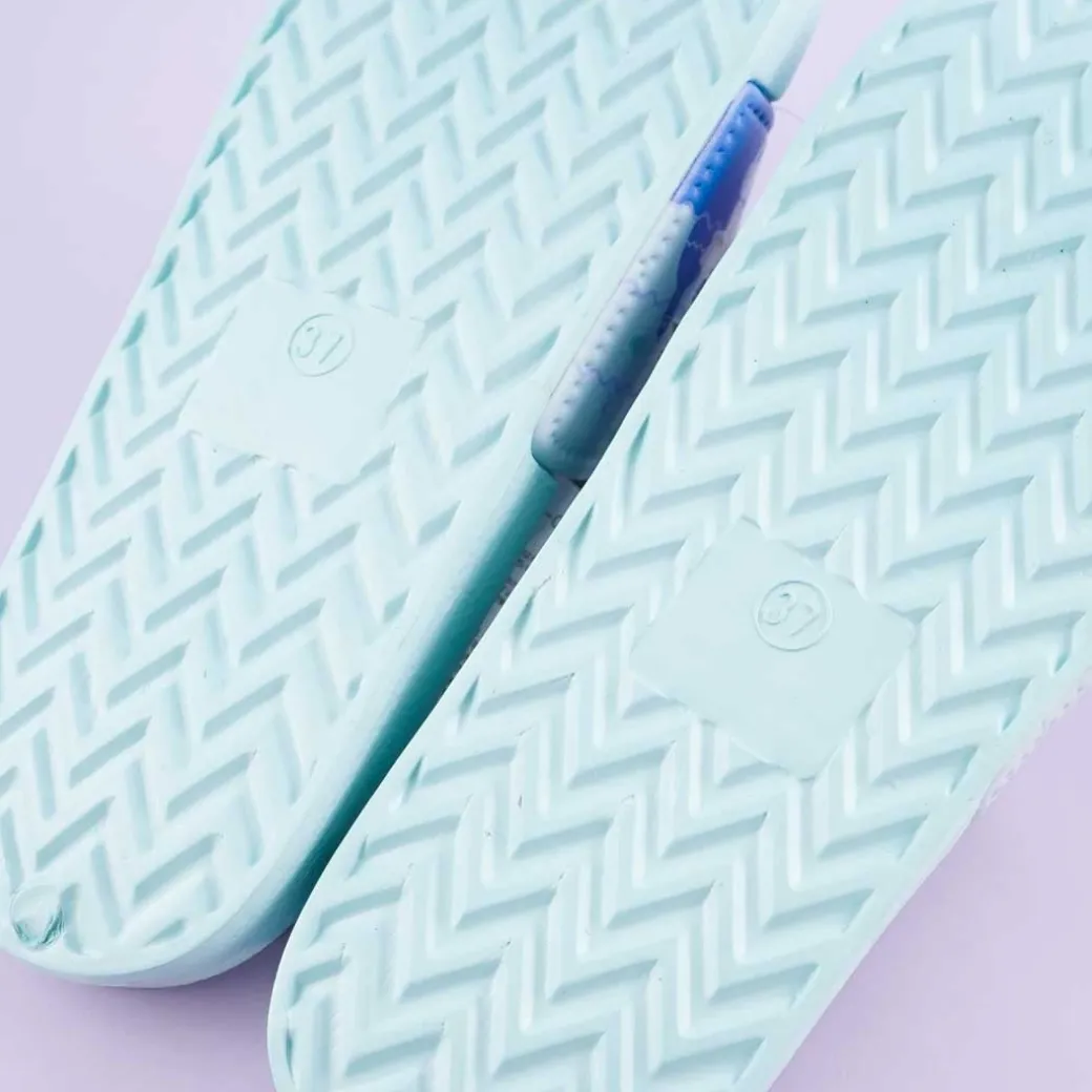 - A kawaii pair of medium blue slippers with an illustration of Tom Nook, Marshal, and other Animal Crossing characters