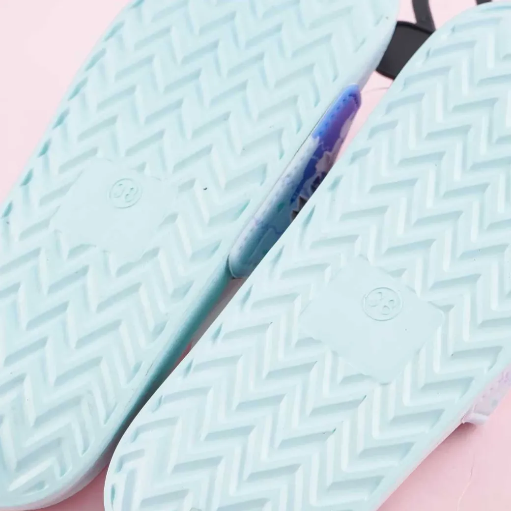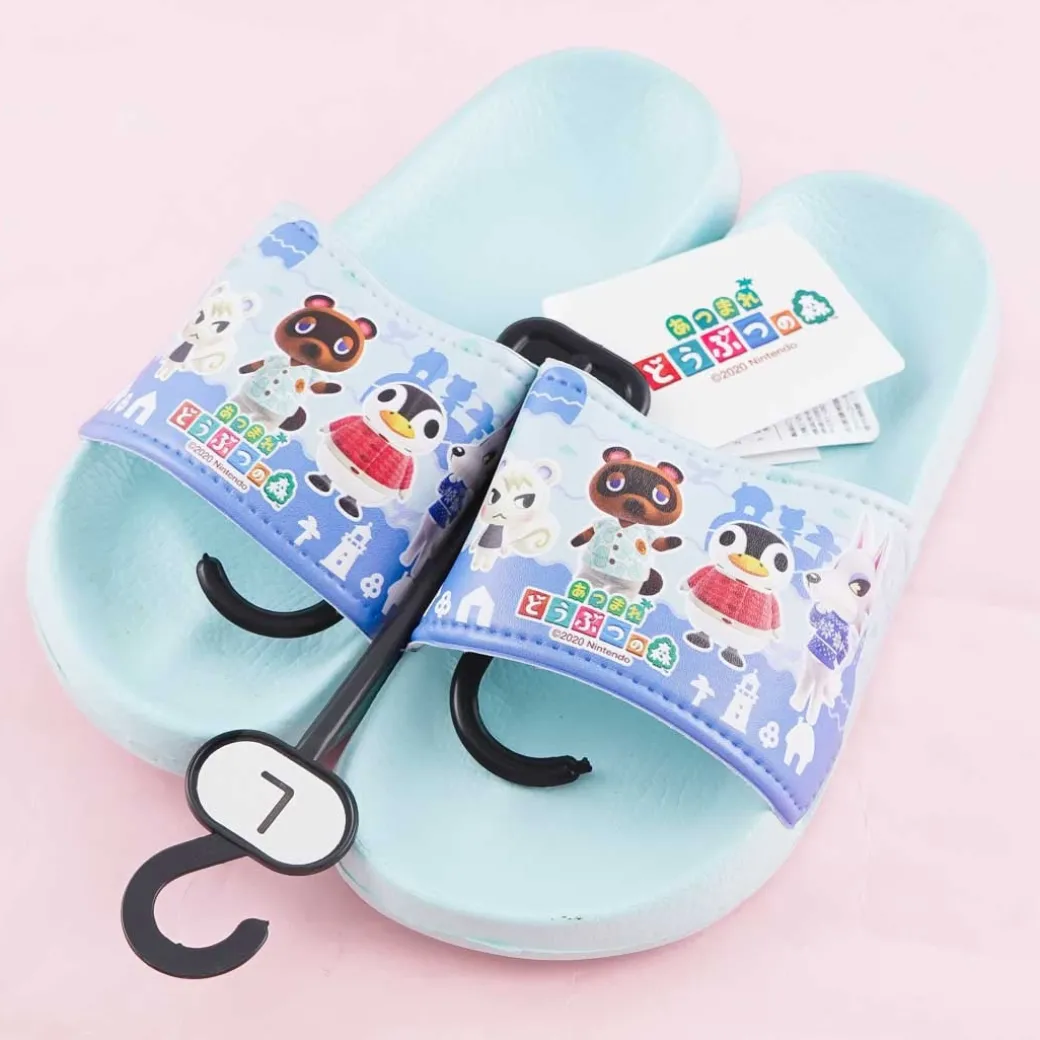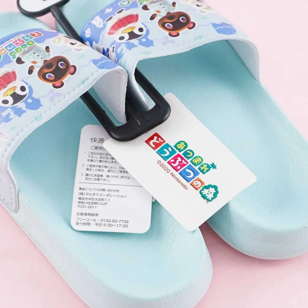 - A cute pair of large-sized blue slippers with an illustration of Aurora, Tom Nook, and other Animal Crossing characters