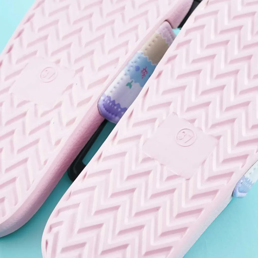 - A kawaii pair of medium pink slippers with an illustration of Molly, Isabelle, and other popular Animal Crossing characters