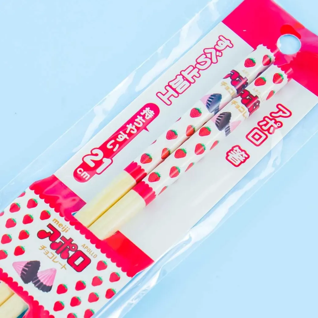 - A kawaii pair of bamboo chopsticks featuring prints of the packaging of Apollo Strawberry chocolate