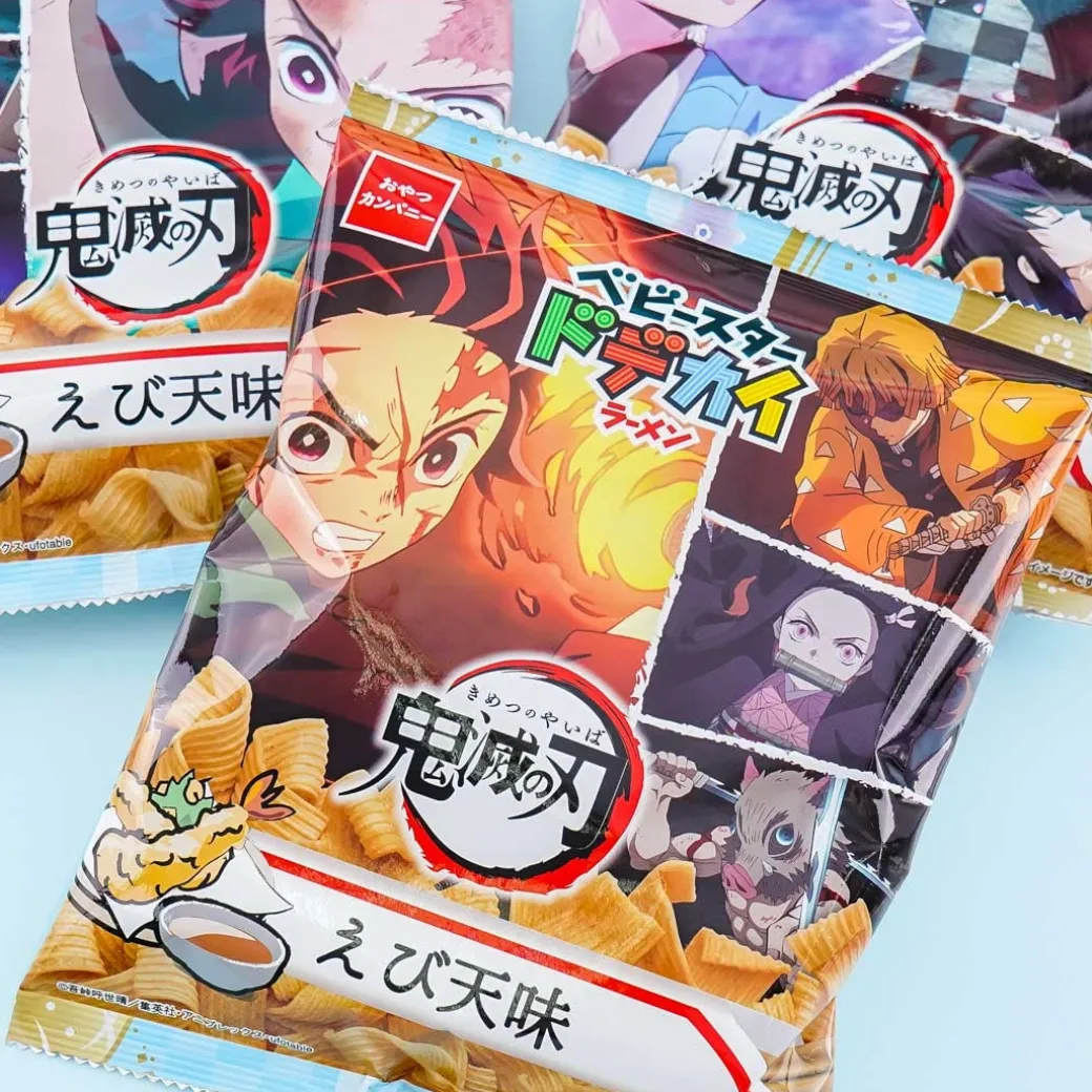 - A pack of shrimp-flavored ramen snacks illustrated with Demon Slayer characters