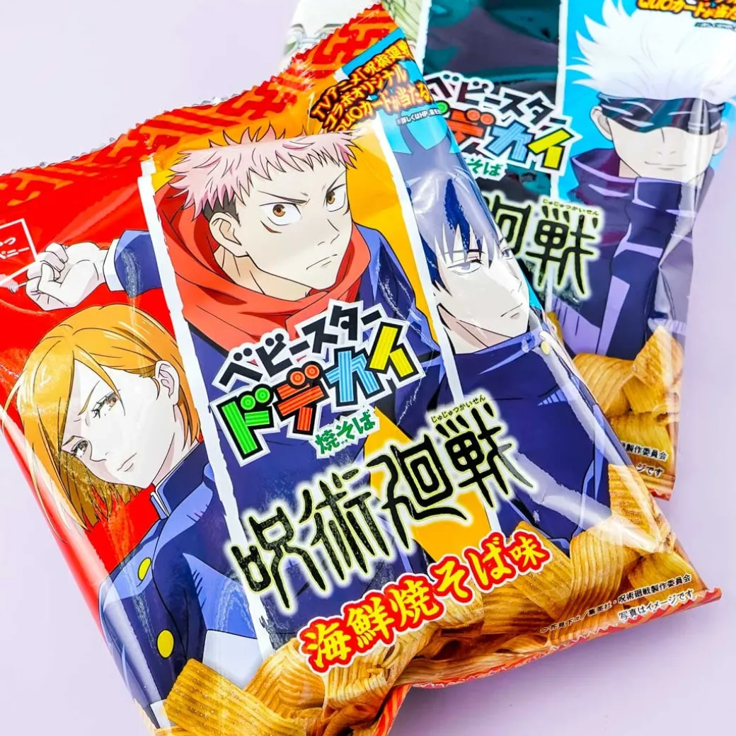 - A pack of seafood-flavored noodle snacks illustrated with Jujutsu Kaisen characters