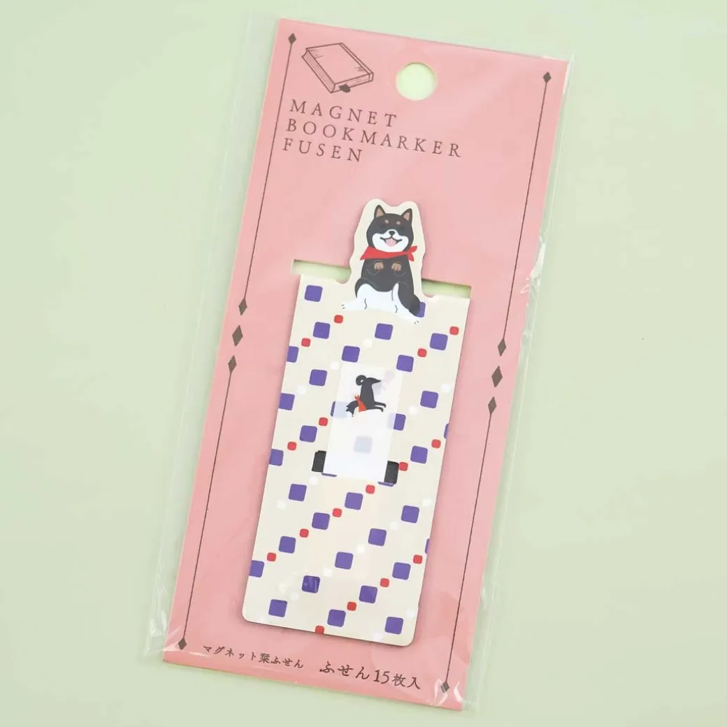 - A cute set consisting of a magnet bookmark and sticky tabs with prints of a black Shiba Inu
