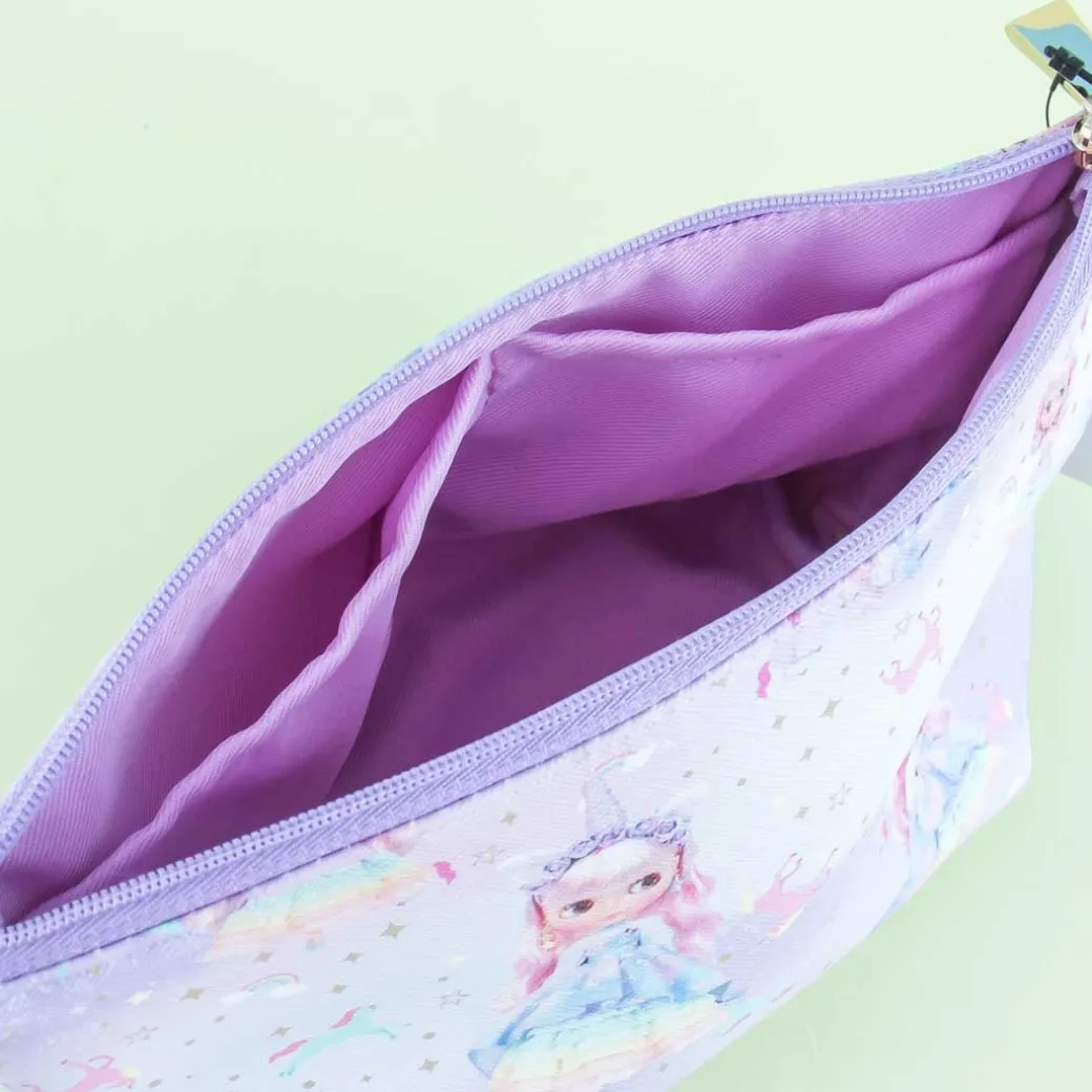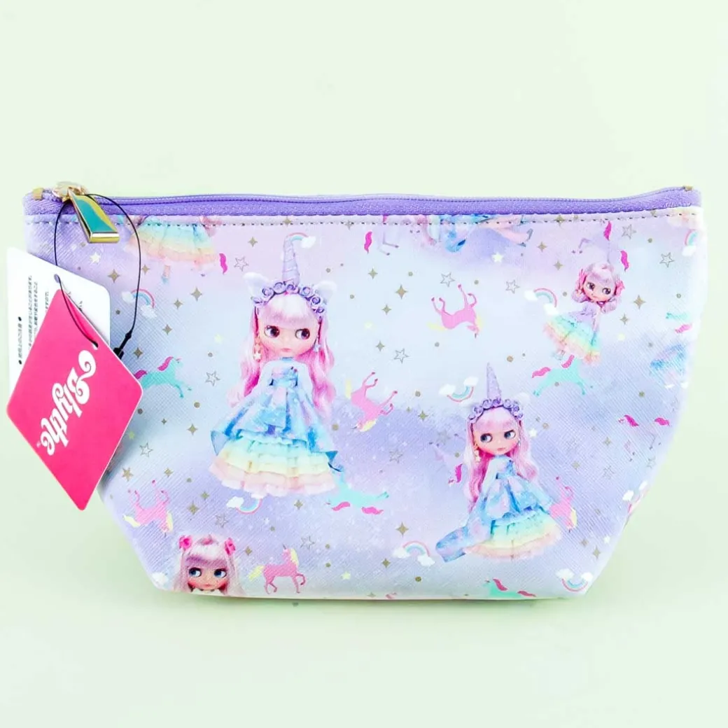 - A kawaii pouch covered n prints of a Blythe doll surrounded by rainbows and unicorns