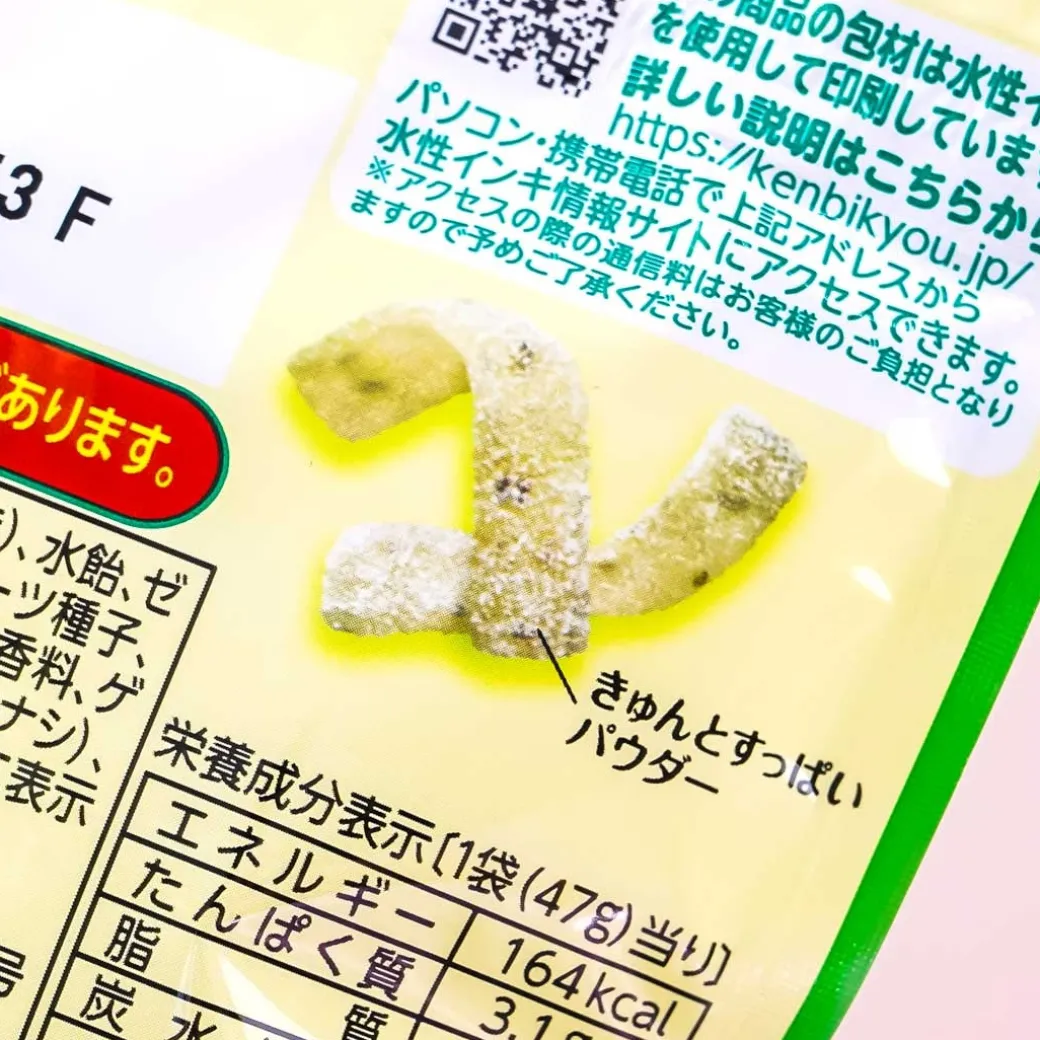- A pack of pasta-shaped gummies in kiwi flavor coated with sour powder and sugar