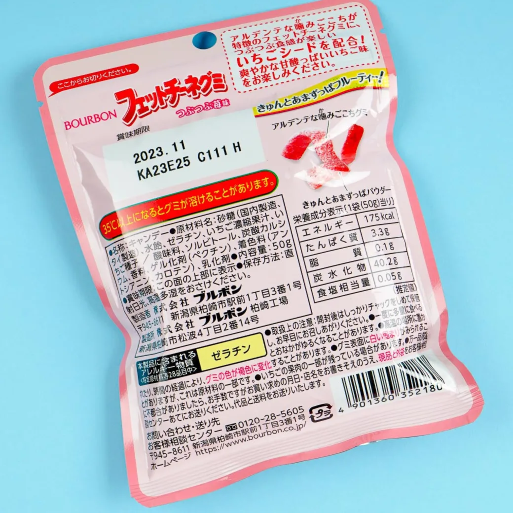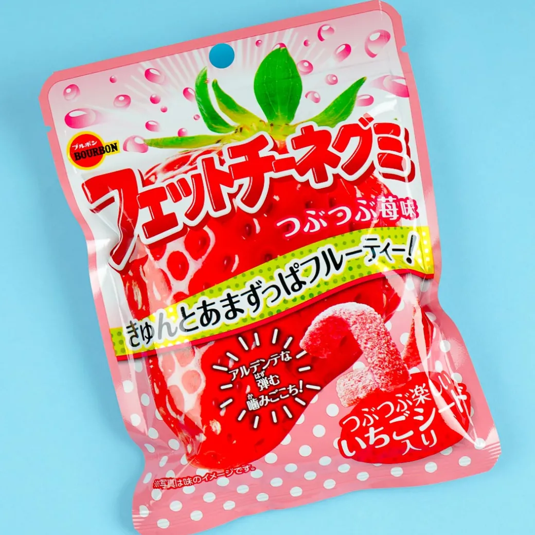 Enjoy the sweet and sour taste of this fettuccine-shaped gummy candy! It’s made with strawberry juice and seeds to recreate the fruit’s flavor and grainy texture.