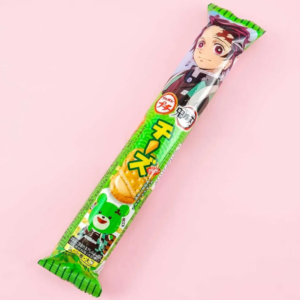 - A pack of bite-sized biscuit sandwiches filled with cheese cream featuring prints of Demon Slayer: Kimetsu no Yaiba character Tanjiro Kamado