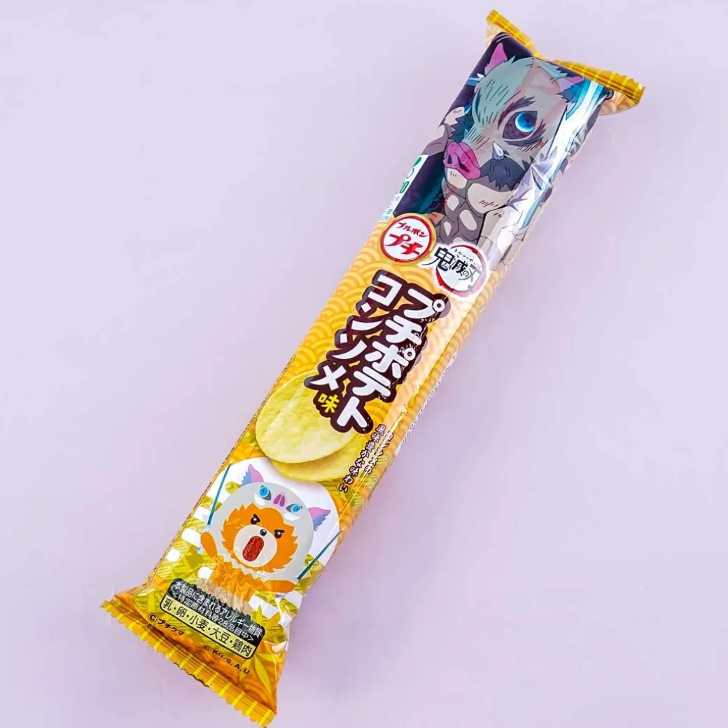 - A petite-sized pack of clear soup-flavored potato chips featuring Demon Slayer: Kimetsu No Yaiba character Inosuke Hashibira