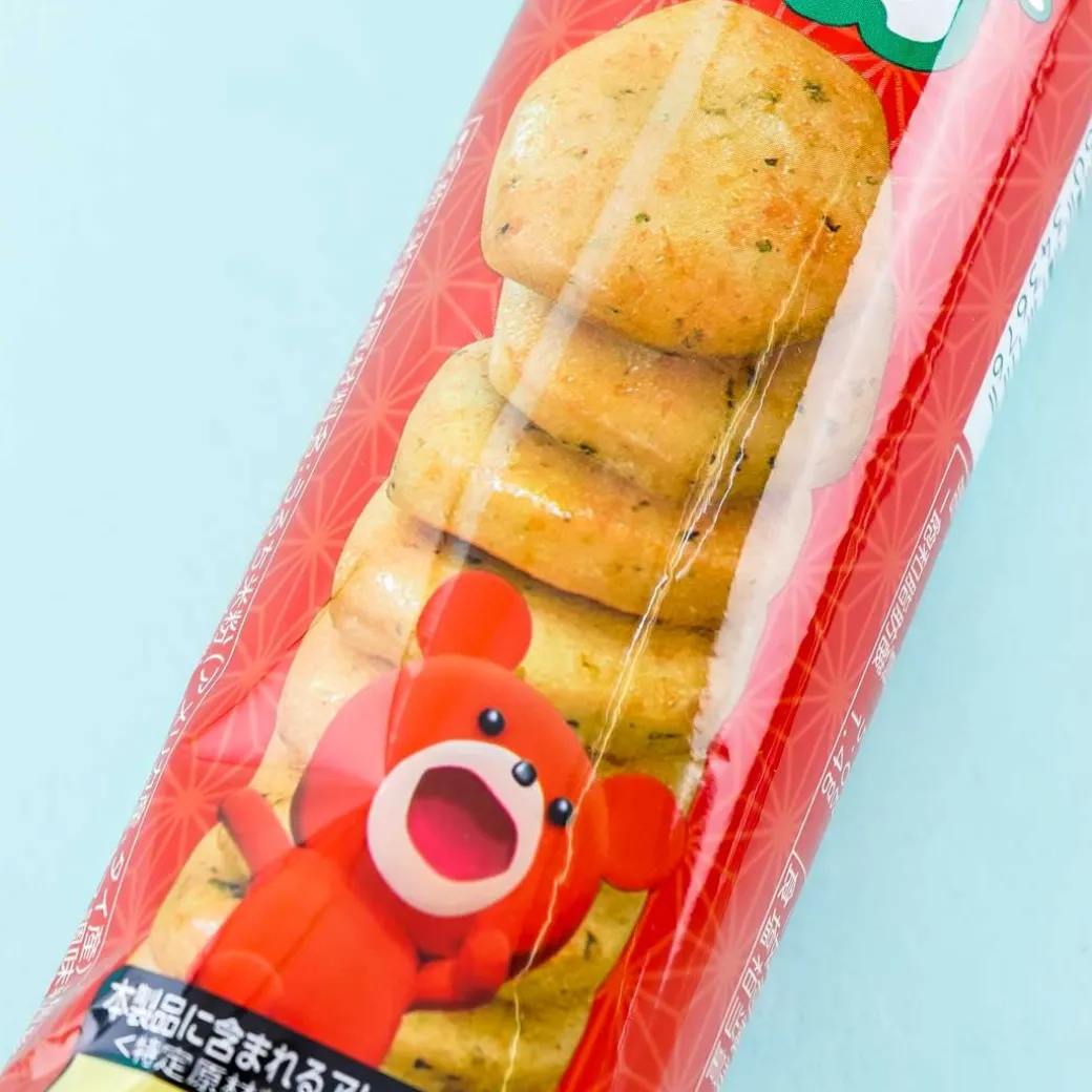 - A pack of bite-sized round rice crackers flavored with seaweed and sweet soy sauce