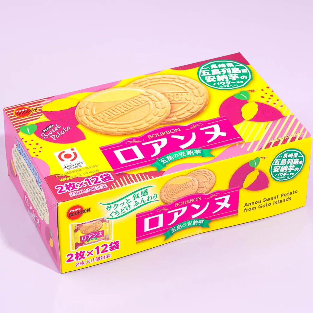 Pair this box of round biscuit sandwiches with your favorite cup of tea or coffee! These delicious snacks are filled with fragrant sweet potato cream that’s made with Anno sweet potatoes sourced from the Goto Islands in Nagasaki Prefecture.
