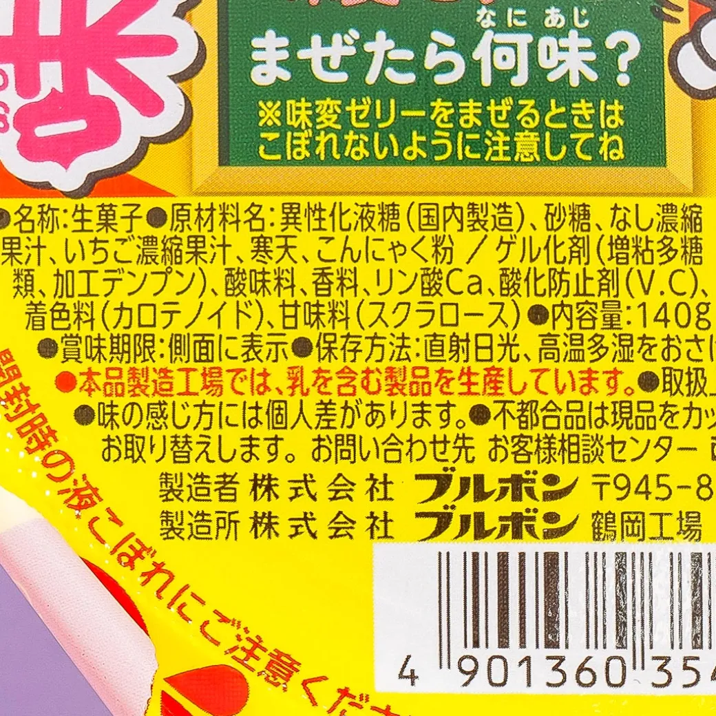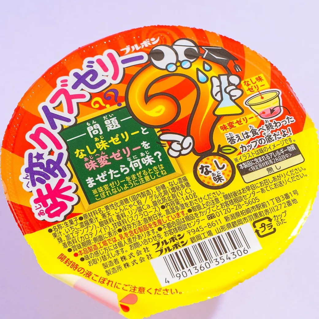 This pack of pear-flavored jelly has two different layers that change taste when mixed together. Can you guess what the new flavor is? Don’t worry if you can’t guess, you can find the correct answer at the bottom of the cup once you finish it.