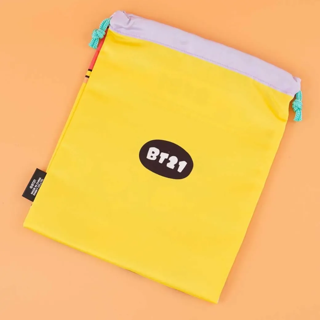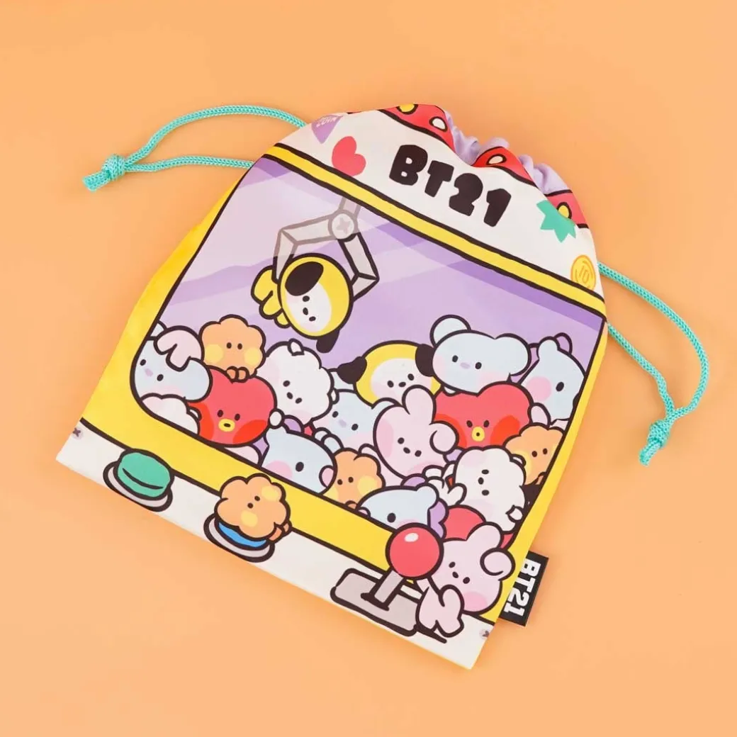 - A cute small drawstring pouch with prints of BT21 inside a crane machine