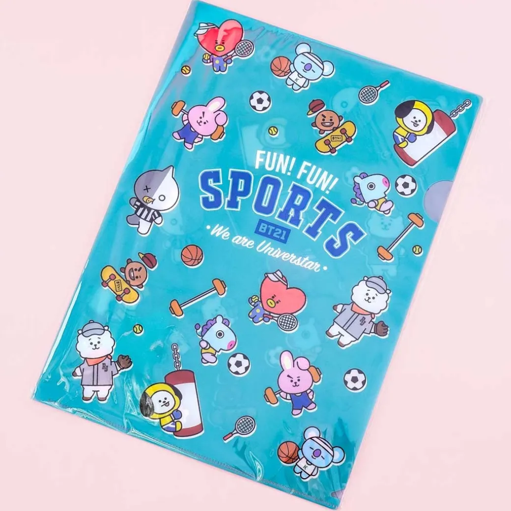 - A semi-transparent A4 file folder with illustrations of BT21 characters playing sports