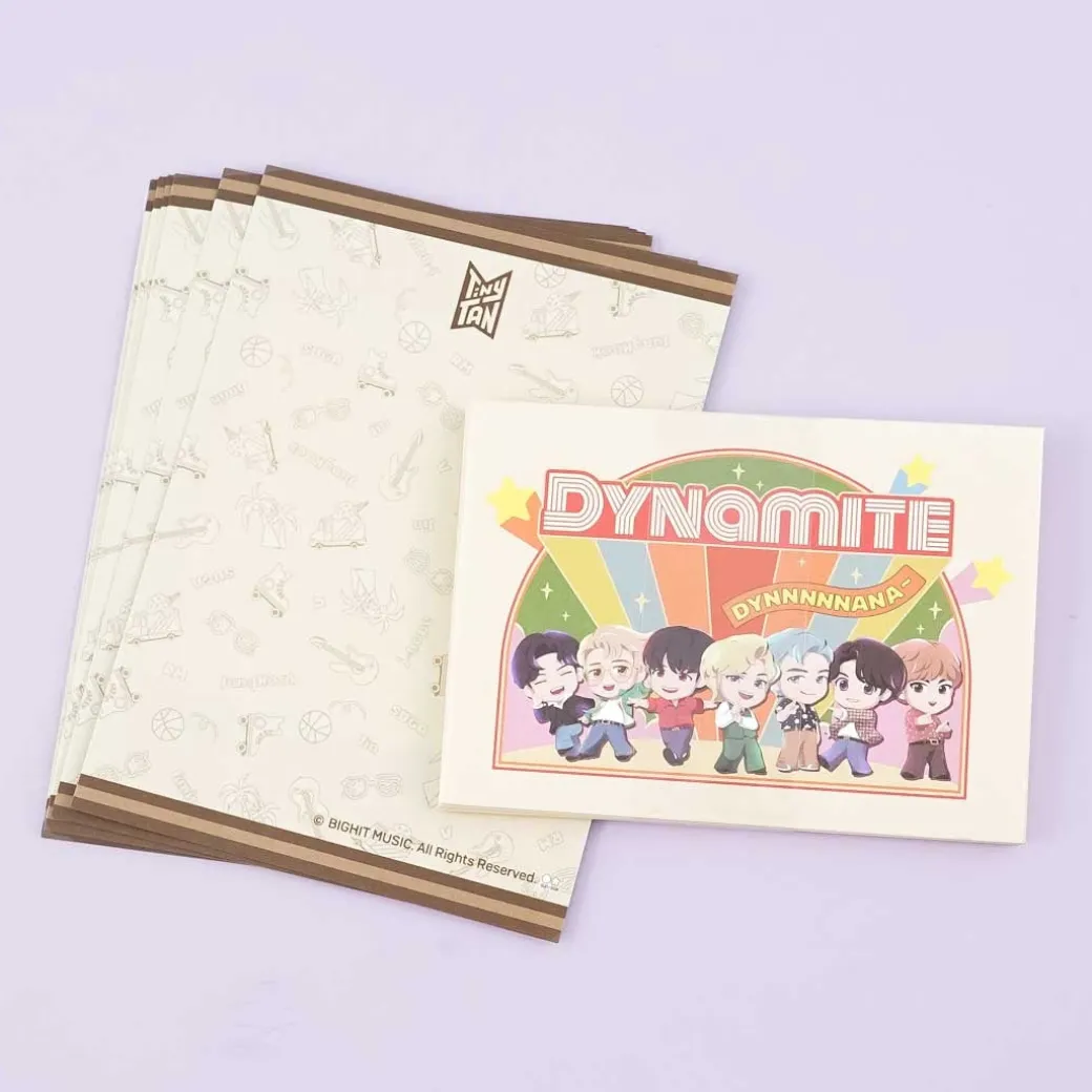 - A cute small-sized letter set with illustrations of BTS as TinyTAN doing their group pose on the Dynamite MV