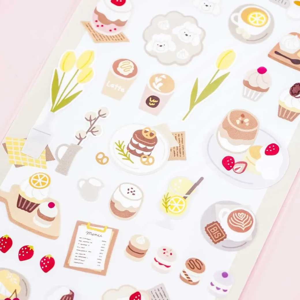 - A kawaii sheet of die-cut stickers illustrated with pastries from a cafe