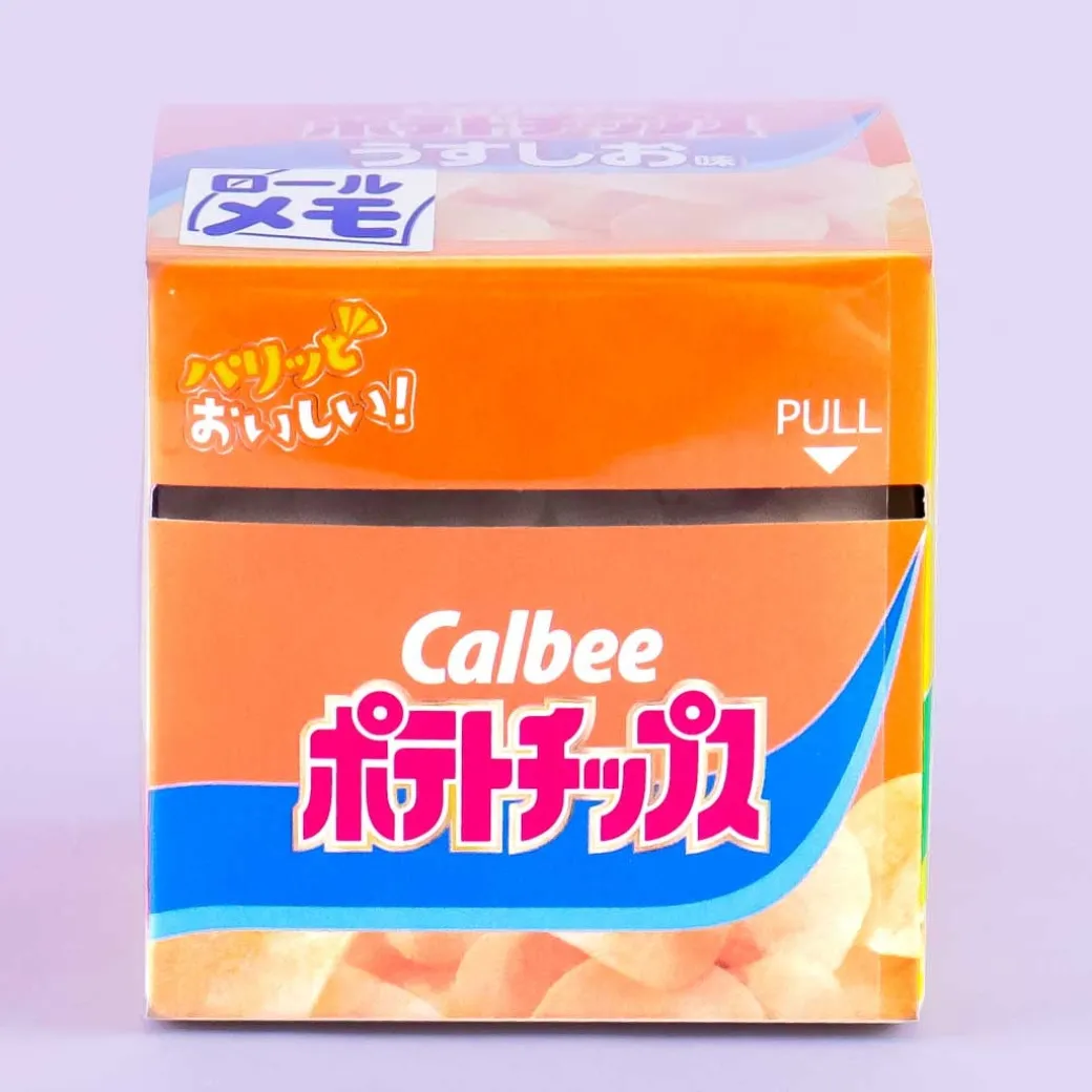 - A memo pad pad roll in a box resembling Calbee Potato Chips packaging