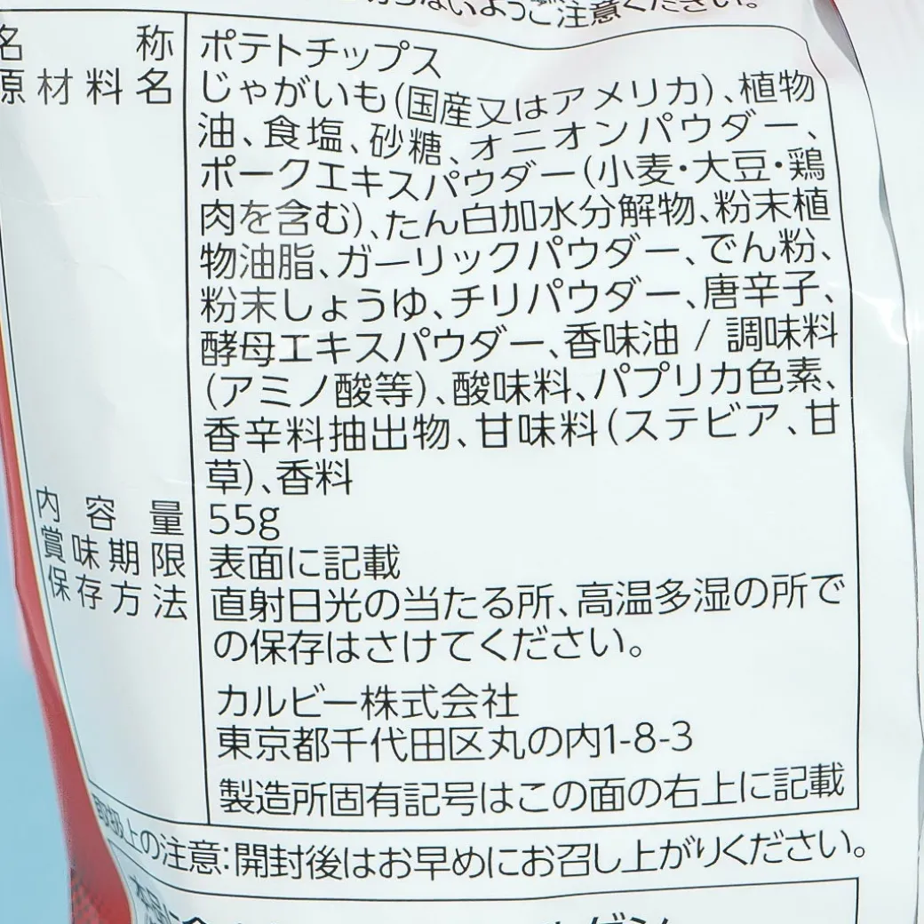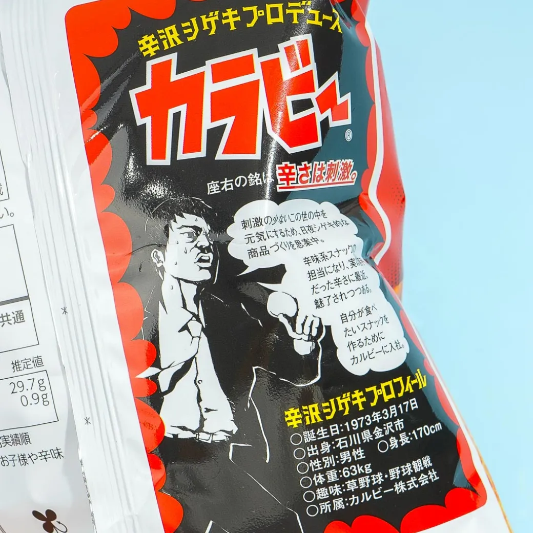 Enjoy this thick-sliced potato chip snack with your friends! It features a fictional Calbee character, Karazawa Shigeki, who loves producing spicy flavors. This snack has the addictive taste of garlic, chili, and spices.