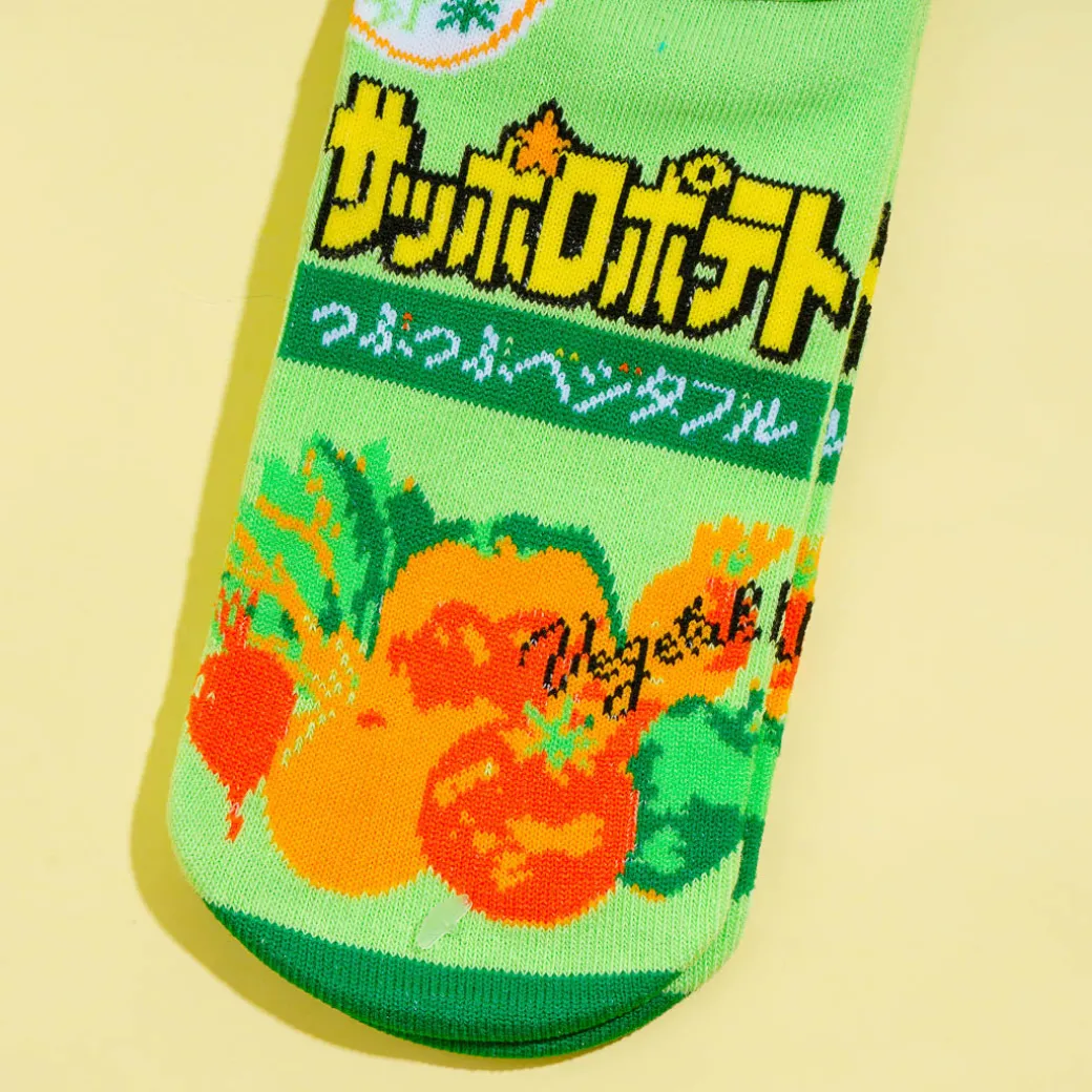 These socks showcase prints of the packaging design of Calbee Vegetable Sapporo Potato snacks. Wear them while lounging around the house!