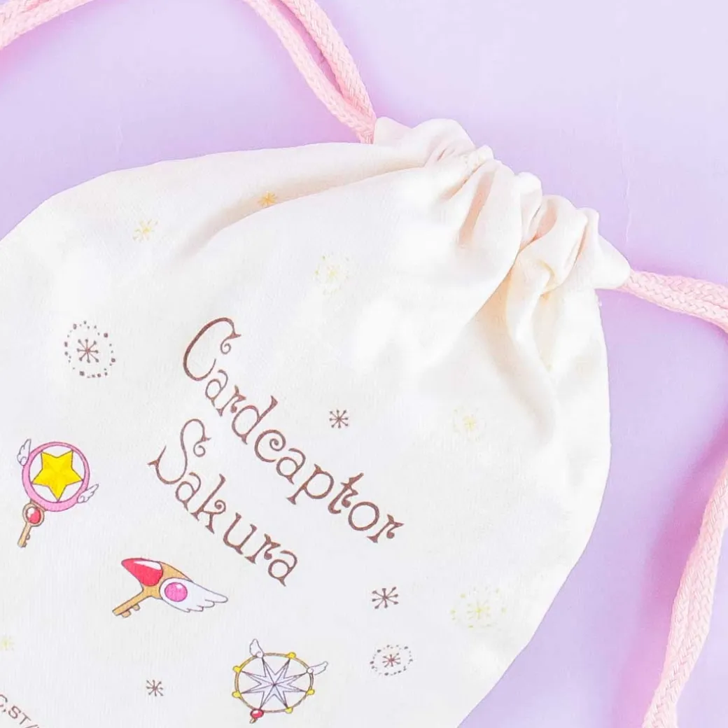 - A cute cotton drawstring bag featuring prints of the wands and cards from Cardcaptor Sakura: Clear Card