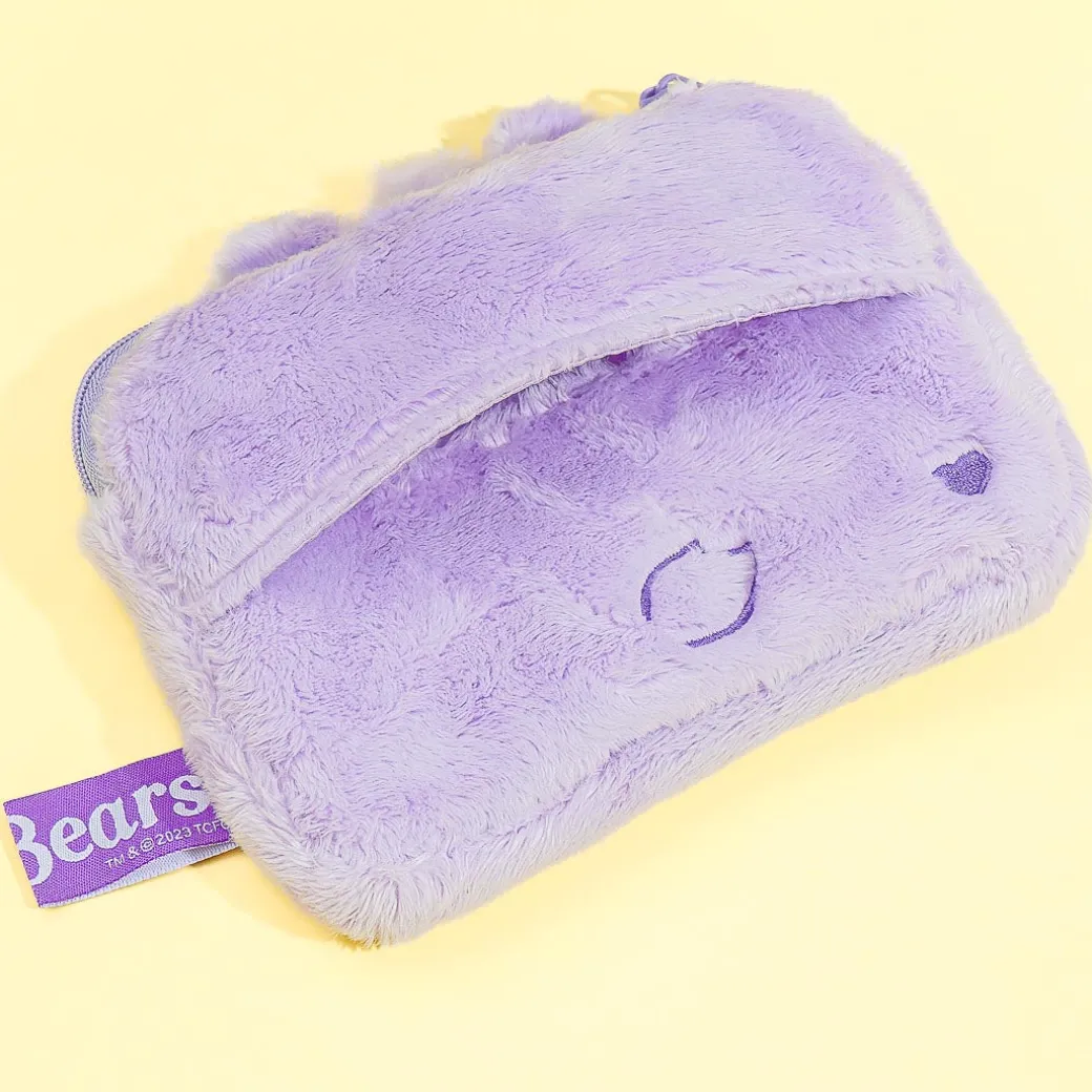 Store lipstick and charms inside this cute Harmony Bear pouch from the Care Bear series! This zippered pouch is made from soft, fluffy material. It has a compartment for pocket tissues at the back.
