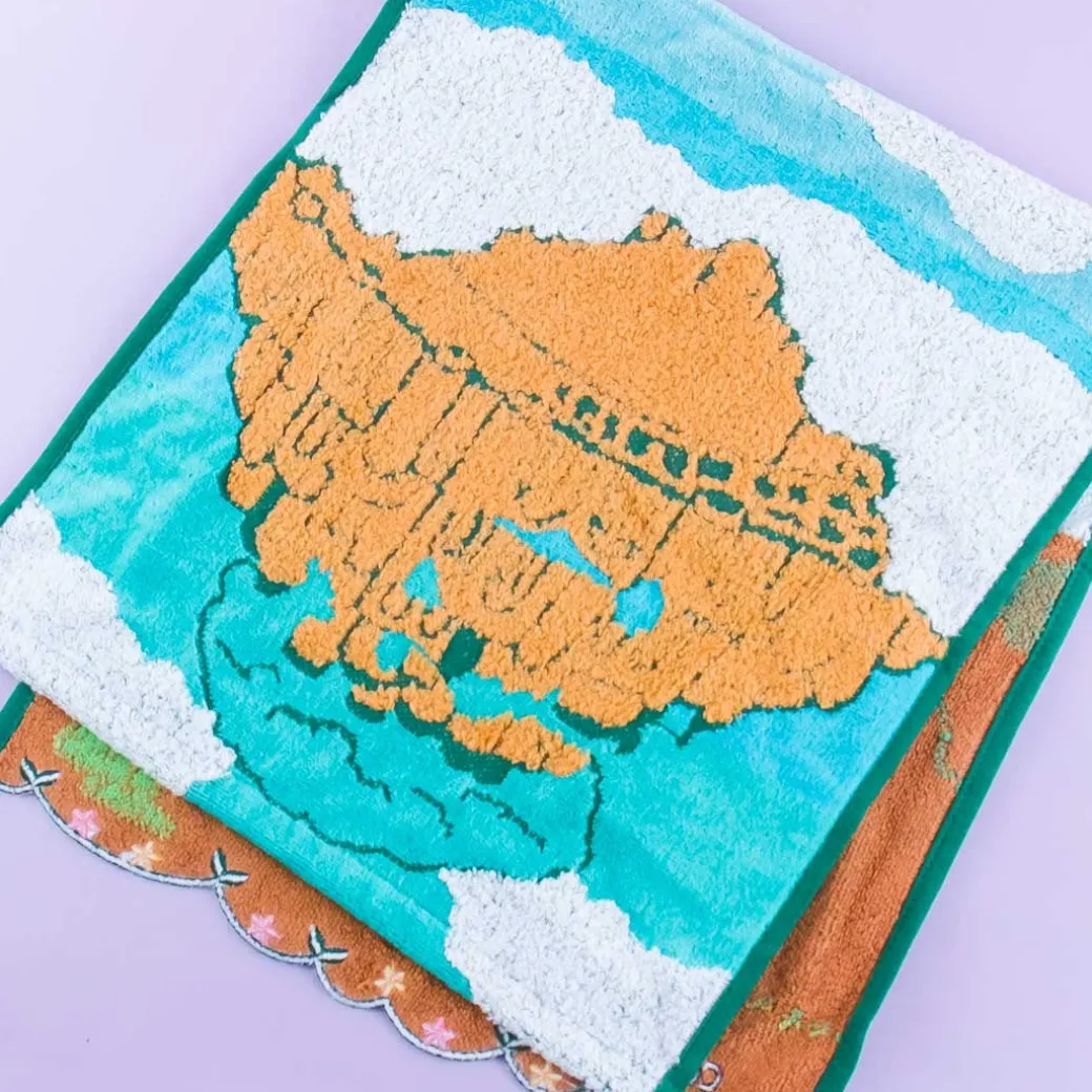 - A kawaii long towel covered in prints of Castle in the Sky characters in a forest