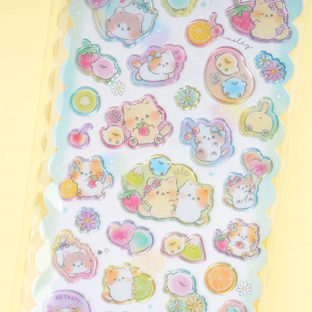 Have fun decorating your notebooks with these super cute stickers! They feature kawaii prints of a cat and hamster playing with fruits. These stickers have holographic foil outlines for added cuteness.